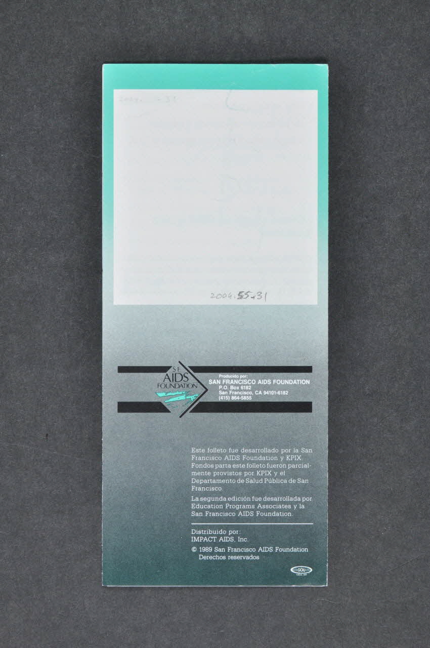 SF // AIDS // FOUNDATION // // Prodicido por: // SAN FRANCISCO AIDS FOUNDATION // P.O. BOx 6182 // San Francisco, CA 94101-6182 // (415) 864-5855 (En partie médiane.), versoSous-titre