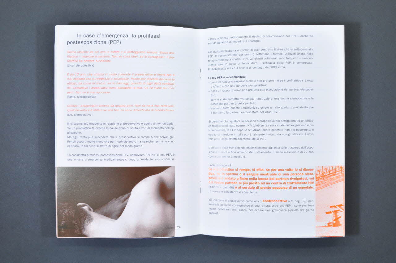 Intérieur. Fond blanc, impression en noir. Témoignages et remarques en marge en orange. Points importants en orange. 15 photos noir et blanc en bas de page gauche : baiser, douche, mains, caresses, tasse de café, bébé, couple parlant, femme au téléphone. Vignettes colorées en orange en bas de page droite. Texte émaillé, en débuts de paragraphe, de nombreux témoignages de personnes séropositives ou de partenaires séronégatifs. / Sommaire - p.4 Quand, à qui et que dois-je dire de ma séropositivité ? "Dans votre vie quotidienne, la décison de dévoiler votre statut sérologique ou votre maladie vous appartient." - p.6 Faire connaissance - La première fois. "Soumise à la protection de la personnalité, la séropositivité de quelqu'un ne peut être dévoilée sans le consentement de la personne séropositive" - p.8 Informer le partenaire lors de relations sexuelles passagères "Les personnes séropositives ne portent pas seules la responsabilité du sexe à moindre risque' - p.10 Amour, désir et sexe : on peut faire tant de choses ! - p.13 Se caresser l'un l'autre avec la bouche - c'est possible ? - p.16 Autres maladies sexuellement transmissibles - p.18 "En" parler - p.20 Le préservatif - une partie des préliminaires - p.22 Des points importants concernant le préservatif (qualité, lubrifiant, conservation, mode d'emploi) - p.24 En cas d'urgence : la prophylaxie post exposition (PEP). "Si le préservatif se déchire, s'il glisse ou si vous oubliez une fois de le mettre, ou si du sperme ou du sang menstruel d'une personne séropositive parvient dans la bouche du / de la partenaire, adressez-vous dans les plus brefs délais à un centre de traitement du VIH ou au service des urgences d'un grand hôpital" - p.26 Renoncer au préservatif ? Dans le cas de partenaires sérodifférents :"il est impératif que tous deux soient conscients des risques qu'ils encourent, qu'ils en parlent ensemble et expliquant leur choix. Enfin, les deux partenaires doivent être d'accord sans aucune réserve." - p.28 Ne peut-on pas tout de même éviter le préservatif si... ? "Si, lors de la dernière mesure, la charge virale se situait au dessous du seuil de détection, le risque d'une transmission sexuelle du VIH est certes massivement réduit. Mais on ne peut exclure une transmission. C'est pourquoi le sexe à moindre risque reste important." / Attention à la transmission de virus résistants / "Les rapports protégés sont vivement recommandés aux couples dont les deux partenaires sont séropositifs si tous deux suivent un traitement combiné anti-VIH et que celui-ci ne s'avère pas assez efficace chez l'un des partenaires ou sur les deux ; si seul un des deux partenaires suit un traitement combiné anti-VIH ; s'il est possible qu'une autre maladie soit transmise sexuellement." - p.32 Contraception - p.34 Désir d'enfant - p.36 Des moments difficiles : Le résultat du test, les premiers temps / commencer un traitement combiné / La maladie se déclare / Penser pour son / sa partenaire / Séparation "S'il y a séparation, un point devra absolument être observé : l'état sérologique du / de la partenaire séropositif (ve) ne devra être révélé à personne" - p.40 Troubles survenant suite à une infection VIH non traitée ... - p.42 ... ou aux effets secondaires d'un traitement combiné anti-VIH - p.44 Conseils et soutien (associations...) - p.46 Adresses utiles