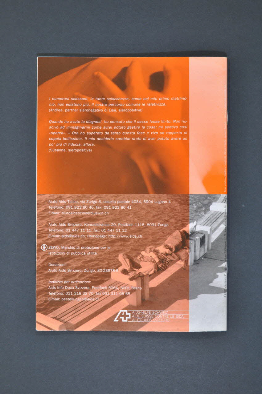 Aiuto Aids Ticino, // via Zurigo 3, casella postale 4034, 6904 4 (L'adresse, en caractères blancs, figure dans la partie inférieure de la quatrième de couverture.), sur la couvertureNom d'association, logo