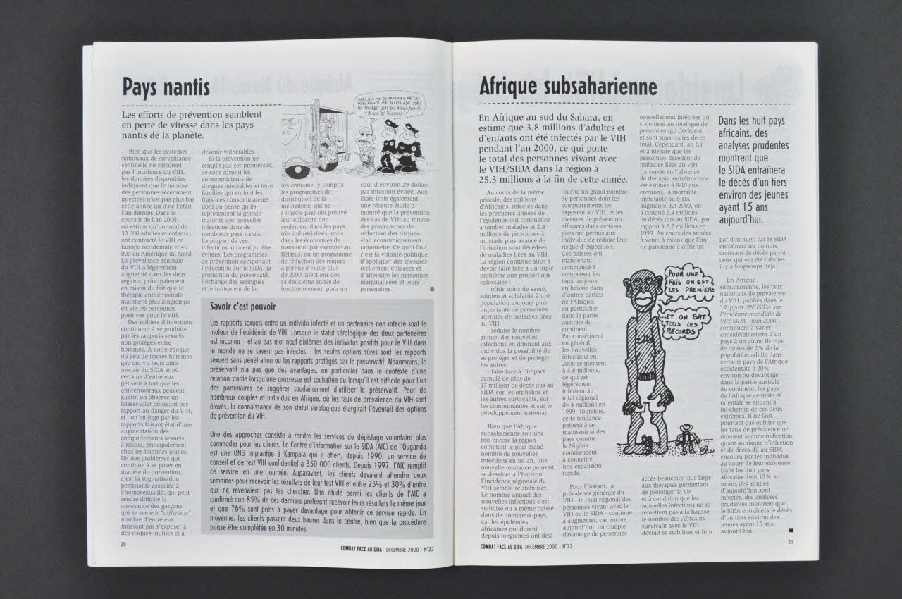 p 4-11 Entretien avec Jean-Louis Sagot-Duvauroux, Insécurité sanitaire : la barbarie marchande peut-elle perdre la main? (épidémie au niveau mondial, sida et insécurité sanitaire générale au Mali; nécessité de créer un "service public mondial de santé"; "autour du sida peut naître un nouvel internationalisme extrêmement fécond, et un rapport de force multiforme capable d'ébranler la mécanique impériale du marché capitaliste) p 5-12 Femmes d'Ouganda (travail photographique de Patrick Bard, de l'Agence Editing : prise en main par les femmes de la lutte contre le sida en Ouganda) p 13-32 Dossier : Rapport ONUSIDA 2000 Le texte intégral (L'épidémie "galope comme jamais" ; responsablités de l'industrie pharmaceutique, des Etats et des organismes internationaux) - Vue d'ensemble (épidémie mondiale beaucoup plus importante que ce que l'on avait anticipé il y a une décennie) - Europe orientale et Asie centrale - Asie - Amérique latine et Caraïbes - Interaction des facteurs qui alimentent la transmission sexuelle - Pays nantis ("les efforts de prévention semblent en perte de vitesse") - Savoir c'est pouvoir (importance du dépistage) - Afrique sub saharienne - Le sida amplifie les inégalités de développement (carte croisant les données d'ONUSIDA et celles de l'Indicateur de Développement Humain) - Comment l'Afrique fait-elle face au VIH? - Des communautés soutiennent les orphelins dans leurs foyers : un modèle de prise en charge à peu de frais. - Le SIDA frappe les investissements et ralentit la croissance économique - Combien faudrait-il pour faire la différence? (Intensification de la riposte : impérative et abordable / 3 milliards de dollards par an) p. 33-5 Hubert Lisandre, La prévention, c'est l'angoisse...(introduire le plaisir dans la prévention : parler de sexualité, de créativité; importance de l'écoute) p. 36 Hubert Lisandre, Gui-gnol, Gui-gnol !(polémique Dustan, Act Up sur le relapse) p. 37 Denis Méchali, VIH et Sida : 10 ans après (évolutions récentes de la demande de dépistage et de la prise en charge du sida, hôpital de Saint-Denis; précarisation croissante...) p. 38 Agnès Deurveilher, Prévention en soirée techno (citation des associations travaillant à la réduction des risques : Techno Plus Paris, Montpellier, Nantes, Toulouse; le Tipi Marseille, Crew 2000 Edinbourg, Livello 97 Bologne, Dance Drug Alliance Londres, Energy Control Barcelone, Eve& Rave Berlin) p. 39-40 Fabrice Boudinet, de l'Amicale du Nid, L'asile territorial, droit à conquérir pour les prostitué(e)s étranger(e)s ( Intermède, action de l'amicale du Nid, prévention du VIH, minibus... situation des migrants, des ressortissants homosexuels ou transsexuels des pays homophobes p. 41-2 Hélène Delmotte Sans histoire et sans mémoire? (à propos du livre de Lutz Van Dijk, la déportation des homosexuels). Onze témoignages Allemagne 1933-1945) p. 41 Christophe Barbillat, Le sens des mots ( témoignages bouleversants mais seuls les juifs et les tziganes ont été l'objet du plan de "solution finale"; pour les homosexuels il s'agit de persécutions qui doivent être reconnues et réparées en tant que telles) P 43 Annonce de l'association Sida mémoires Dos de couverture : annonce de l'élargissement du "champ d'investigation" de la revue avec le sous-titre "Drogues, santé, société" (ouverture "parce que l'action contre le sida ne peut exister dans l'indifférence des enjeux de santé publique et des questions de société; parce que la sécutité sanitaire, la problématique des usages de psychotropes par exemple ne peuvent être considérées isolément; parce que, pour développer un véritable mouvement unitaire contre le sida, il faut réussir à concerner l'ensemble des acteurs de la santé, du social (...) lutte à partager entre tous les citoyens, dans le cadre de la construction d'une démocratie sanitaire qui reste, aujourd'hui, un voeu pieux" (...)
