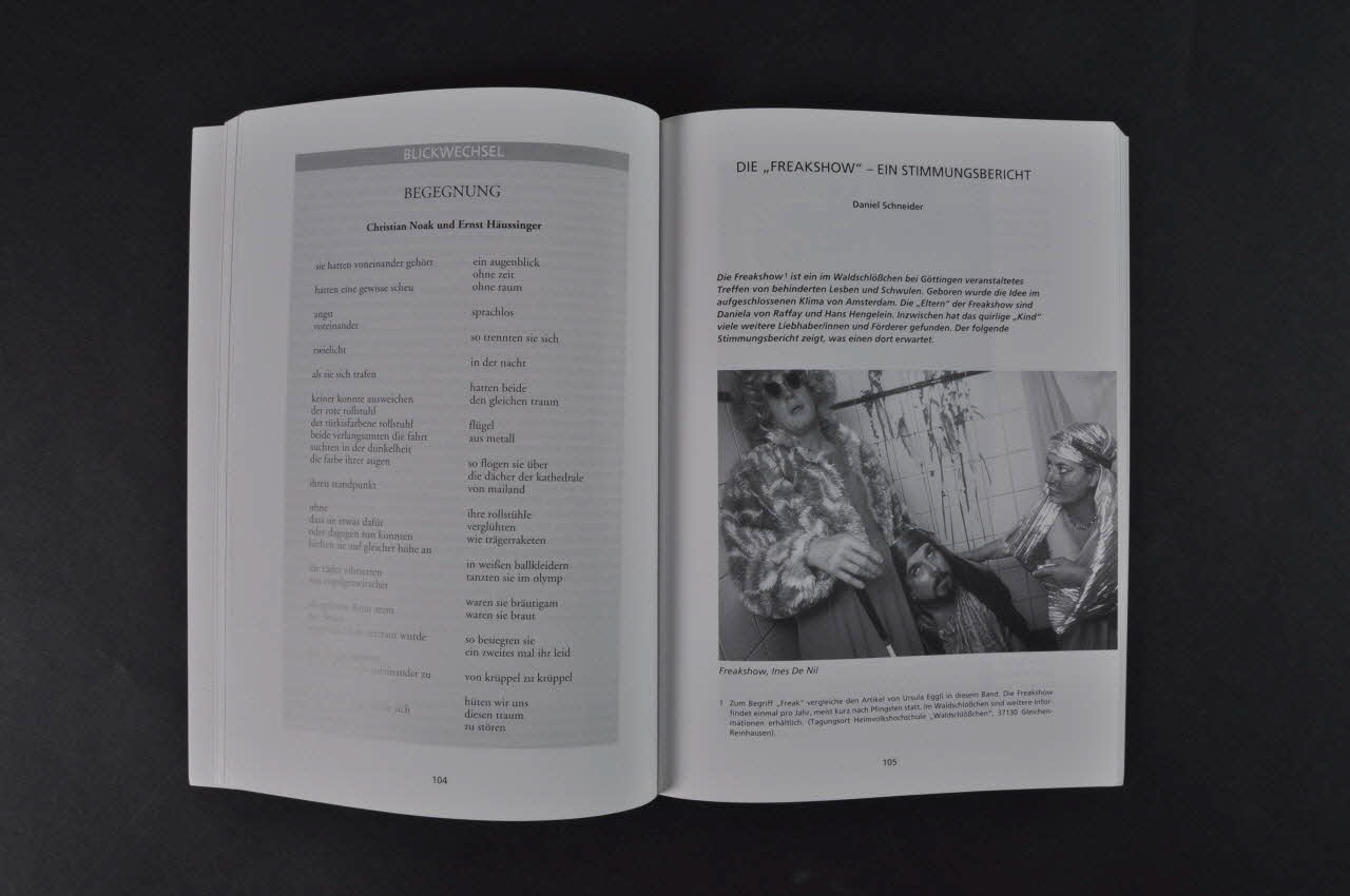 I. Behinderung und Gesellschaft : historische Perspektive (Handicap et société : perspective historique // - Amory Burchard und Ekkehard Schwerk : "Haus des Eigensinns" oder Museul der Wahnsinnigen Schönheit" // - Uli Meurer : AIDS verändert sein Gesicht // - Peter Wiessner : Vom Monstrum zum Fürsorgeobjekt : Zur geschichte der Funktionalisierung behinderter Menschen // - Didi Danquart : Der Pannwitzblick // - Udo Sierck : Behinderte Menschen und die "Euthanasie" Diskussion // - Peter Wiessner : "Der Teufel hat über ihn seinen Sack ausgeleert" // II. Behinderte Lebenswelten : Blickwechsel, Erfahrungen und Ansätze // Betroffenengruppen // - Daniel Schneider : A blind hero is something to be ! // - Daniel Schneider : Blickwechsel : Ausgeliefert // - Werner Lesemann : Hämophil und HIV-positiv // - Christian Noak und Ernst Häussinger : Blickwechsel : Diagnose Toxoplasmose // - Horst Havermann : Gehörlose Menschen und AIDS-Hilfe // - Ursula Eggli : Blickwechsel : Drei Liebesgeschichten // - Daniela von Raffay : Blickwechsel :"Als ob die nicht schon si genug auffällt..." // Sexualität und Behinderung (Sexualité et handicap) // - Ursula Eggli : Meinen Körper vom Zustand des Neutrums befreien // - Christian Noak und Ernst Häussinger : Blickwechsel : Begegnung // - Daniel Schneider : Die "Freakshow" - ein Stimmungsbericht // - Arno Hardt : Blickwechsel : Gemeinsame Erfahrungen // - Ahima Beerlage : Schlangenperspektive // - Kalle Krott : HIV-Prävention und Sexualpâdagogik in der Arbeit mit geistig behinderten Menschen // -Angela Marchewka : Hilfe-HIV, AIDS ! Erfahrungsbericht einer Wohngruppe für geistig behinderte Menschen // Behinderte schwule Leben // - Hans- Hellmut Schulte : "Einen wir mich hätte ich früher links liegen lassen". Behinderte Schwule und soziale Barrieren // - Christian Noak und Ernst Häussinger : Blickwechsel : Sie haben angefangen mich zu beobachten // - Horst Schreyer : Blickwechsel : Makellos. Schwuler Körperkult // - Arno Hardt : Meine Erfahrungen mit sexuellen Kontakten // - Hans Hengelein : "Behindertenfeindlich !" - Aspekte einer Kontroverse um ein DAH-Plakat // - Hans-Georg Stümke : Blickwechsel : "Du hättest ja auch was sagen können" Vom Leben mit Morbus Bechterew // Zwischen Selbstbestimmung und Fremdbestimmung // - Martin Eisermann : Der Bilck des Gesetzgebers auf behinderte Menschen // - Daniela von Raffay : Nackt dasthen, liegen oder hängen müssen - der medizinische Blick // - Ottmar Miles-Paul : Selbstbestimmt Leben. Eine Herausforderung für uns und die Gesellschaft // - Barbara Combrink, Regina Spangle und Diana Radke : Leben mit Assistenz // - Uwe Frewert : Persönliche Assistenz - worauf ist zu achten ? // Rechtliche Aspekte // - Gerhard Speicher : Behinderungen und das "soziale Netz" // - Wolfgang Kohl : "Plötzlich habe ich es schwarz auf weiss, was mit mir los ist". Antrag auf Schwerbehinderung // - Friedhelm Krey : HIV und AIDS im Arbeitsleben // - Heidi Eichenbrenner : AIDS-Hilfe als Arbeitgeberin - Erfahrungen aus der AIDS-Hilfe Köln ev // Entgrenzung // - Stefan Etgeton : Zum Verhältnis von Behinderten - bewegung und AIDS-Hilfe // - Christoph Nachtigäller : 30 Jahre BAGH - 30 Jahre Behindertenselbsthilfe // - Christian Schröder : Barrierefreies Leben - utopisch oder machbar ? // - Hans-Peter Hauschild : "Quartärprävention" : kompetent hoffen !Décor