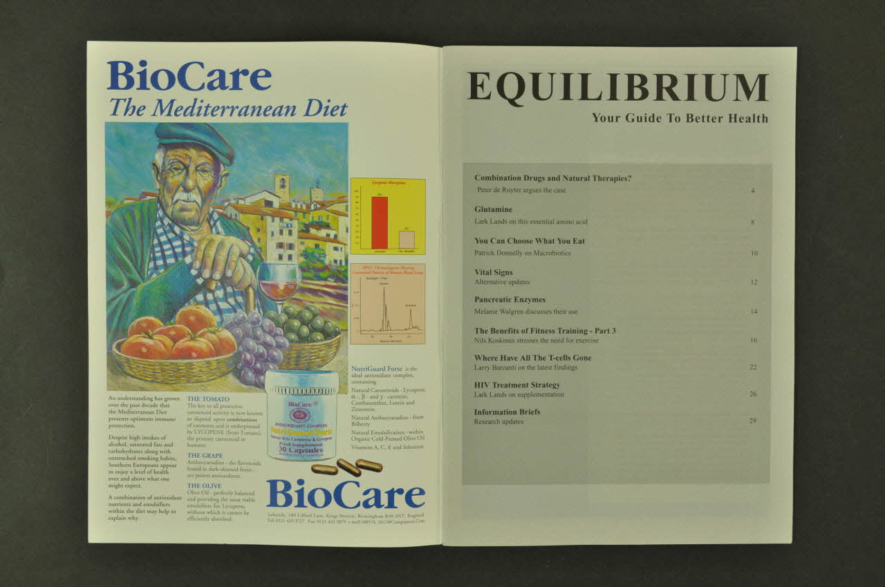 EQUILIBRIUM // Your Guide To Better Health // // Combination Drugs and Natural Therapies? 4 // Peter de Ruyter argues the case // // Glutamine 8 // Lark Lands on this essential amino acid // // You can Choose What You Eat 10 // Patrick Donnelly on macrobiotics // // Vital Signs 12 // Alternative updates // // Pancreatic Enzymes 14 // Melanie Walgren discusses their use // // The Benefits of Fitness Training - Part 3 16 // Nils Koskinen stresses the need for exercise // // Where Have All The T-Cells Gone 22 // Larry Barzanti on the latest findings // // HIV Treatment Strategy 26 // Lark Lands on supplementation // // Information Briefs 29 // Research updates (Sommaire imprimé sur la page 1 sur fond gris, en noir gras pour les titres et en noir pour un rapide descriptif. Le titre principal est inscrit également en noir, suivi d'un slogan imprimé en noir.), à l'intérieurDédicace