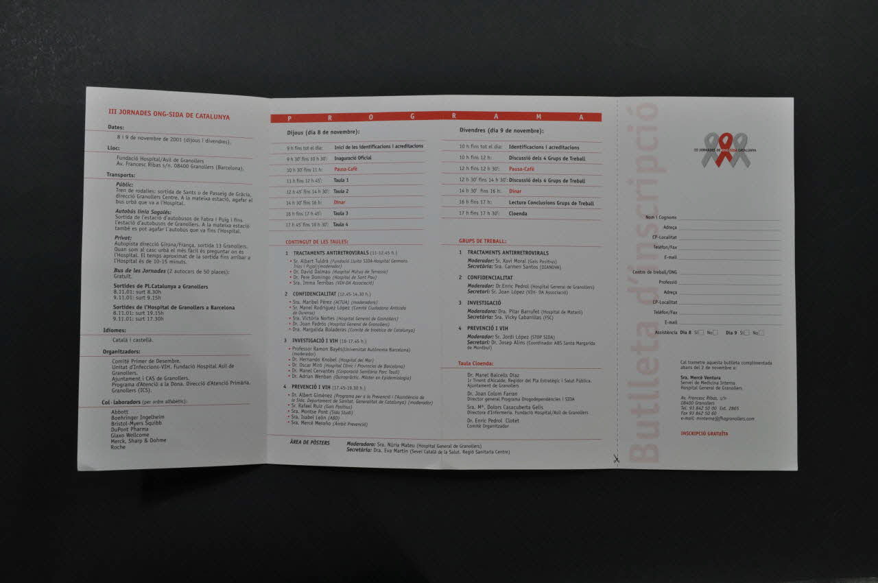 Dijous (dia 8 de novembre): // [...] // 1 TRACTAMENTS ANTIRETROVIRALS // [...] // 2 CONFIDENCIALITAT // [...] // 3 INVESTIGACIO I VIH // [...] // 4 PREVENCIO I VIH // [...] // // Divendres (dia 9 de novembre): // [...] // TRACTAMENTS ANTIRRETROVIRALS // [...] // CONFIDENCIALITAT // [...] // INVESTIGACIO // [...] // PREVENCIO I VIH // [...] (Titres des interventions et groupes de travail: sur les deuxième et troisième volets, se trouve le programme. Les dates sont suivies respectivement des horaires puis des titres des interventions.), à l'intérieurDates: // [...] // // Lloc: // [...] // // Transports: // [...] // // Idiomes: // [...] // // Organitzadors: // [...] // // Col-laboradors [...] (Sur le premier volet, titres des informations pratiques.), à l'intérieurDate