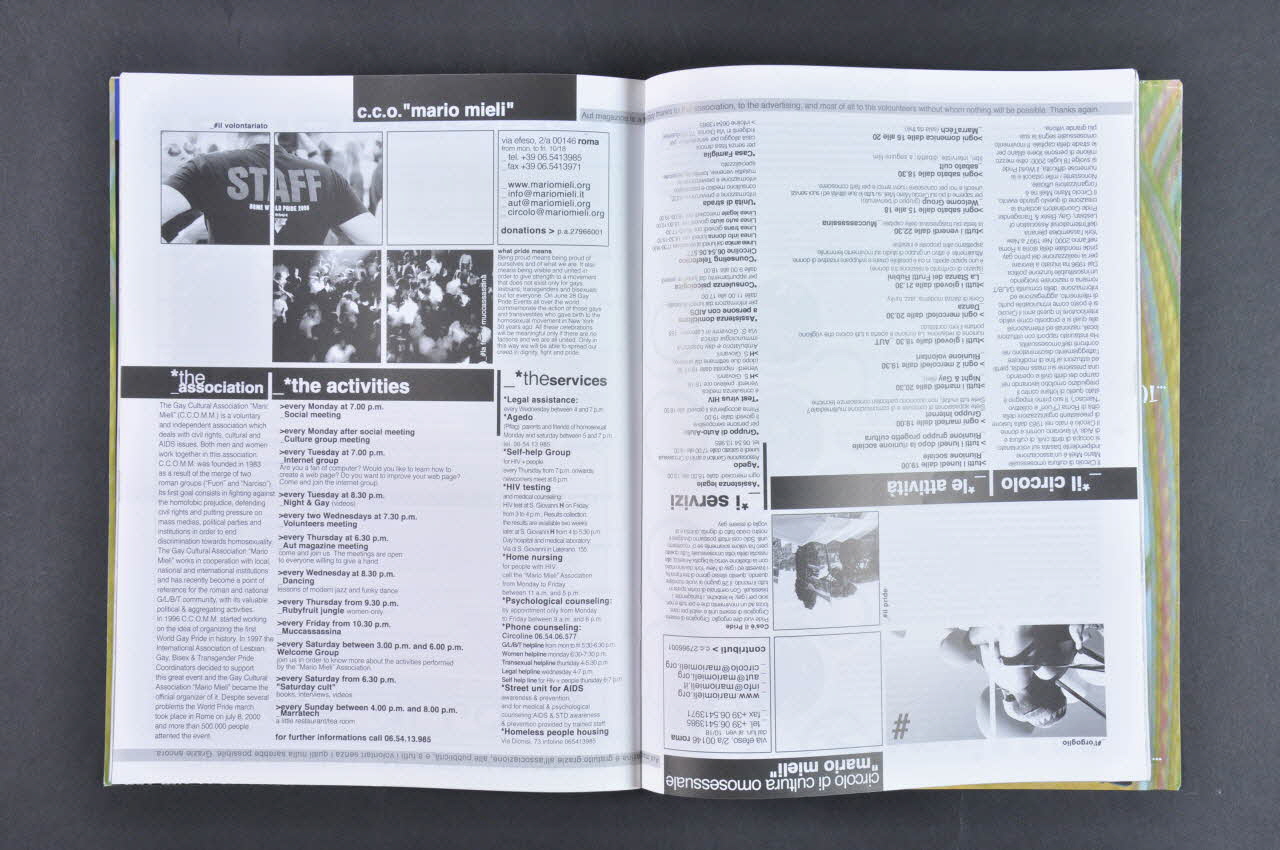 Attualità // 6 Hedwig // [...] // Intervista // 4 Paola&Chiara // [...] // 8 Renée Zellweger // [...] // Moda // [...] // Teatro // [...] // Immaginario // [...] // Libri // [...] // Consigli Legali // [...] // Cinema // [...] // Poesie // [...] // Musica // [...] // Internet // [...] // Cgil // [...] // Arte // [...] // Rubriche // 23 AGenda // 26 Tv // 27 Annunci // 28 Guida GLBT // 32 Non solo gay a Roma // 35 Oroscopo (En face du deuxième de couverture de la face colorée), à l'intérieurIn primo piano // 4 30 ANNI DEL MOVIMENTO GLBY ITALIANO // [...] // Politica // 8 ASPETTANDO IL 1° DICEMBRE // [...] // Avvenimenti // 14 NEW YORK, 11 SETTEMBRE 2001 // [...] // Societá // 18 MISS TRANS // [...] // Profilo // 20 TOM OF FINLAND // [...] // Opinione // 22 BISESSUALI, BISTRATTATI // [...] // Community // 24 UAAR // [...] // 26 NEWS // La pagina del Mieli // 28 IL CIRCOLO LE ATTIVITA, I SERVIZI (Page 2 de la face en noir et blanc), à l'intérieurTitre