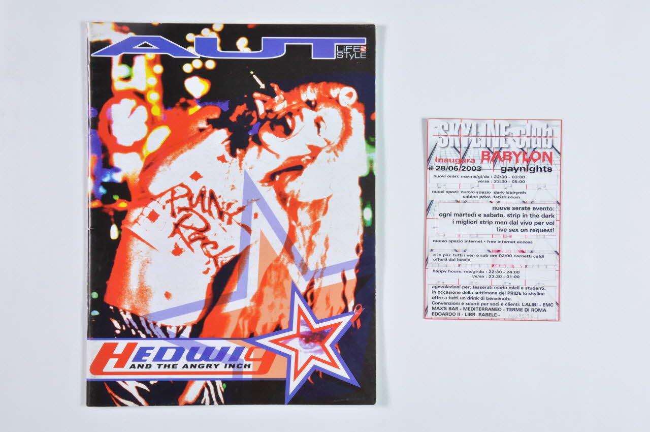 30 anni di cinema gay // nel bel paese (Titre principal du numéro de la face en noir et blanc. // En bas, à droite, en blanc surligné de noir.), sur la couvertureHedwig // and the angry inch (Titre du numéro sur une des deux faces, en caractères rouges, bleus, noirs, et orné d'une étoile), sur la couvertureAUT (Nom de la revue en partie supérieure des deux faces de la couverture), sur la couvertureBABYLON // gaynights (Sur le dépliant, au centre, en caractères rouges, noir et balncs, sur deux lignes), rectoDate, numéro