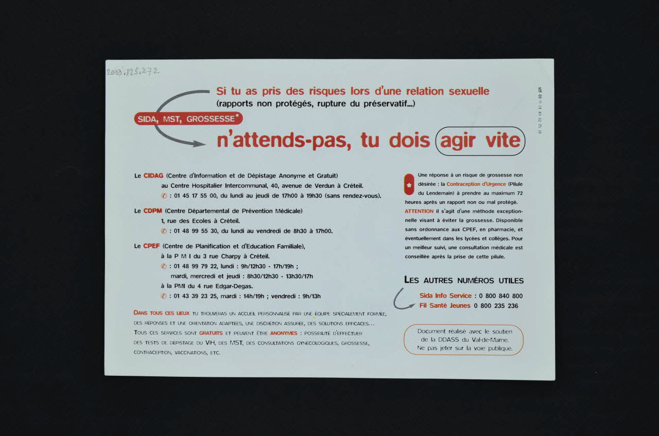 Si tu as pris des risques lors d'une relation sexuelle // (rapports non protégés, rupture du préservatif... // SIDA, MST, GROSSESSE // n'attends-pas, tu dois agir vite (inscription en rouge et en noir en haut), versoLogo
