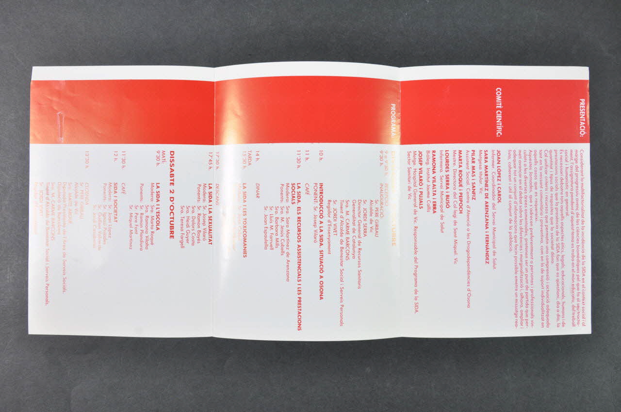 Dépliant de format rectangulaire en papier glacé blanc imprimé en rouge et blanc. Il se déplie en trois volets et est écrit en catalan.