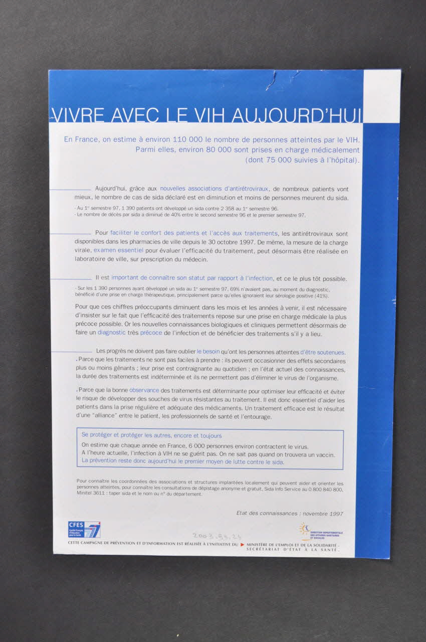 Feuille d'information faisant partie d'une campagne : "La science progresse. Et la solidarité ?". Trois feuilles : Vivre avec le VIH au sein du couple (2003.099.024) / Vivre avec le VIH au sein d'une famille (2003.099.021) / Vivre avec le VIH au sein d'une entreprise (2003.099.022). Le recto de la feuille est le même pour chacune des trois : "Vivre avec le VIH aujourd'hui"