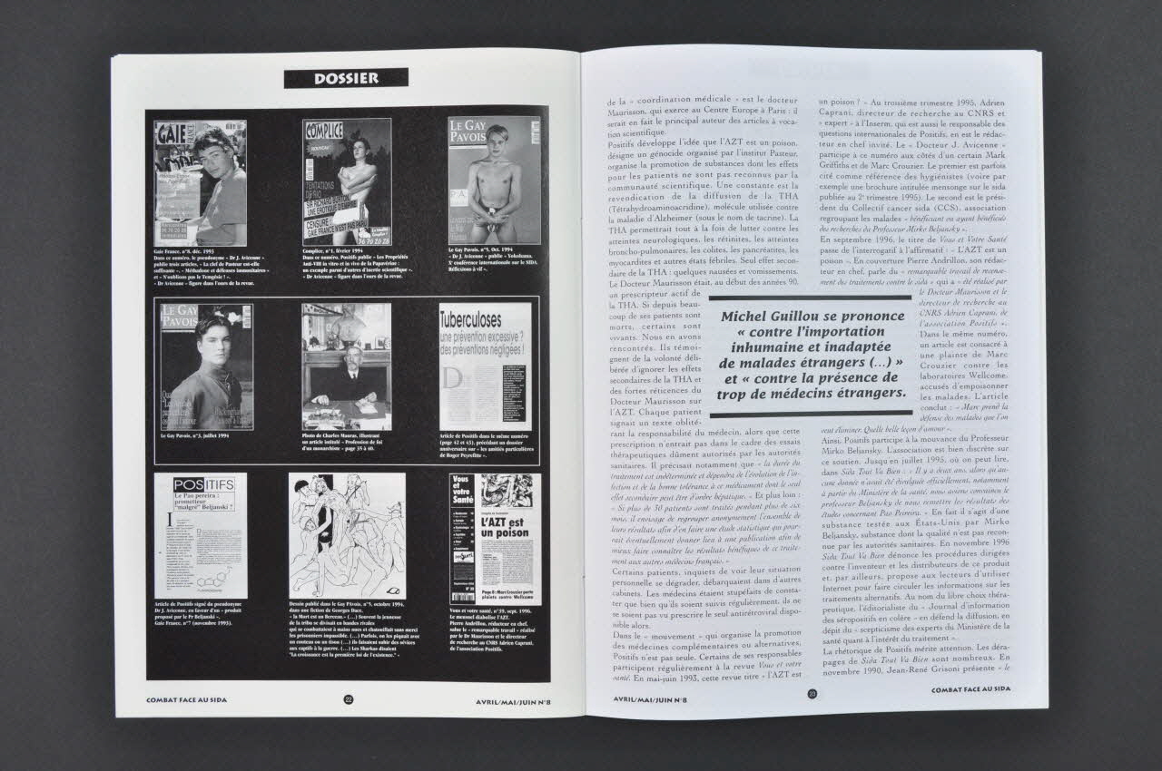 p. 4-6 Entretien avec Patrick Braouezec, député-maire de Saint-Denis , Vivre ensemble (banlieue, toxicomanie, parti communiste...) p. 7 G.A. Un second souffle pour la lutte contre le sida ( l'ACCs lance une campagne intitulée : Sida, la lutte continue) p. 8-9 Actualités (espoir des nouveaux traitements, toxicomanie en prison, départ de Montagnier aux USA, sang contaminé, Sidaction, grèves des internes, appel à dons du patchwork) p. 10 Revue de presse (épidémiologie) (...) p. 11-12 Frédéric Chasseloup de Châtillon, Le discours, les actes et la voltige (réactions de lecteurs à propos de l'interview de Gaymard p. 13 Pierre-Louis Marger, Amiante et sida dans le même bateau (la lutte contre le sida a des conséquences dans d'autres domaines de la santé, par exemple lutte contre l'utilisation de l'amiante p. 14-15 Philippe Stierlin, Recherches et accès aux soins : la politique des laboratoires en question (quête par labos de bénéfices dont certaines recherches font les frais; fiches sur Uclaf et Roche) p. 16-18 Plate-forme sur la toxicomanie en prison (l'intégralité du texte signé en commun d'Act Up-Paris, ACCS, Aides, Auto-Support banlieues, Médecins du Monde, Observatoire International des Prisons, Syndicat de la Magistrature) p. 19-28 Dossier : Connexions dangereuses - Subventions données à Positifs, association douteuse - Des connivences inavouables (connexions de l'association Positifs avec d'une part les promoteurs de médecines dites alternatives et d'autre part avec les milieux pédophiles d'extrême droite de la revue Gaie France) - p. 25-28, Thierry Meyssan, Nazisme et homosexualité, imbrications historiques et retour du refoulé p. 29-31 Jean-Luc Guilhem, L'acceptation active p. 32-34 Agnès Deurveilher, Cuba face au sida (système de soins répressif à Cuba) p. 35 Soirée réussie (soirée des Amis de Combat face au sida