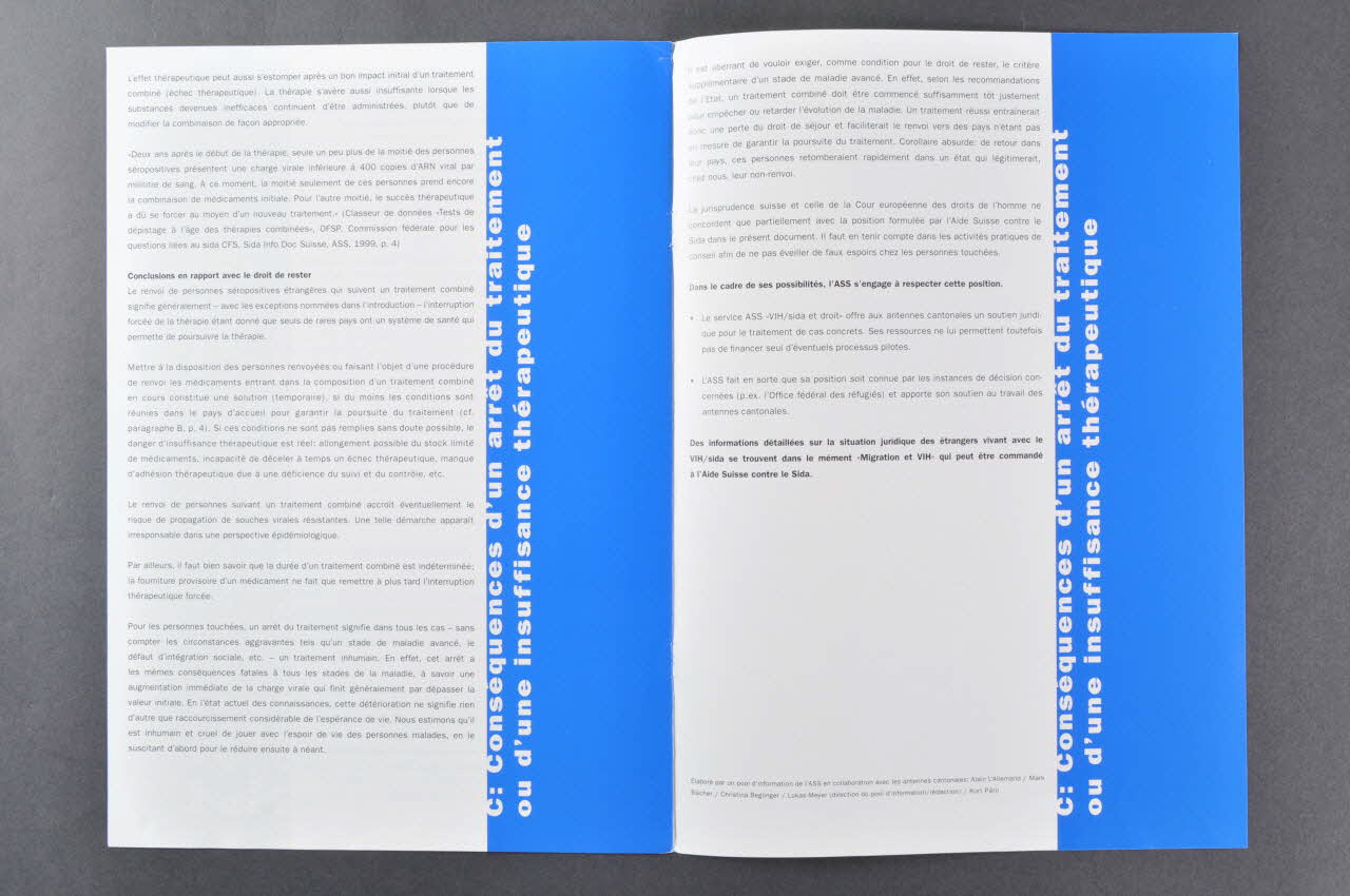 Prise de position de l'association Il faut que les personnes suivent un traitement combiné anti VIH sur indication médicale. "Le seul statut de séropositif ne préjuge pas d'un droit de rester, même pas s'il est certain qu'un traitement combiné n'est pas disponible dans le pays de renvoi. En effet, il n'est pas possible de motiver une inégalité detraitement entre personnes étrangères avec le VIH et personnes étrangères sans le VIH (mais peut-être menacées d'autres maladies) Données sur le déroulement de l'infection. L'initiation de la thérapie. Les conditions nécessaires pour une thérapie combinée. Les conséquences d'un arrêt du traitement ou d'une insuffisance thérapeutique. Conclusions en rapport avec le droit à rester : "Pour les personnes touchées, un arrêt du traitement signifie dans tous les cas un traitement inhumain. En effet, cet arrêt a les mêmes conséquences fatales à tous les stades de la maladie, à savoir une augmentation immédiate de la charge virale qui finit généralement par dépasser la valeur initiale. En l'état actuel des connaissances, cette détérioration ne signifie rien d'autre que raccourcissement considérable de l'espérance de vie. Nous estimons qu'il est inhumain et cruel de jouer avec lk'espoir de vie des personnes malades, en le suscutant d'abord pour le réduire enduite à néant."