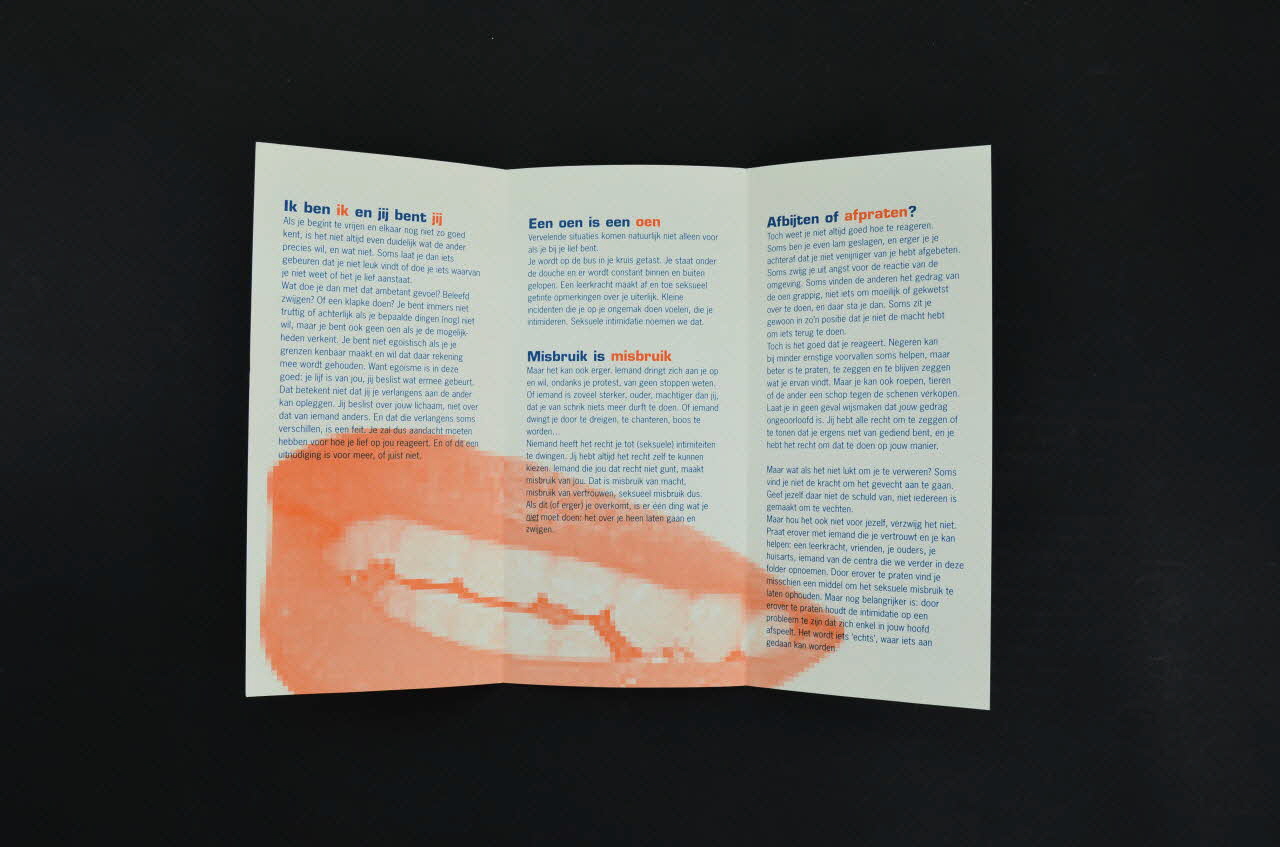 La couverture comporte un fond orange avec un texte en bleu, trois logos en bas et une bouche en sous impression dans le coin inférieur droit. Le dos du dépliant est constitué d'un texte en bleu avec les titres en orange sur fond blanc. L'intérieur du dépliant est constitué d'un texte en bleu avec certains mots des titres en orange. Une bouche figure en sous impression, à cheval sur les trois feuillets intérieurs.Inscriptions
