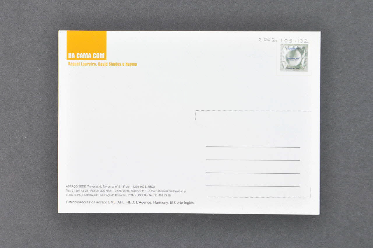 NA CAMA COM / Raquel Loureiro, David Simões e Nayma (En blanc sur orange et en orange sur blanc, en haut à gauche, sur le dos de la carte.), versoDécor