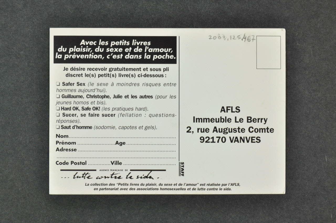 Avec les petits livres // du plaisir, du sexe et de l'amour, // la prévention, c'est dans la poche (Texte imprimé en blanc dans un encadré noir situé en haut à gauche), versoLes codes // de l'amour // ont changé ! (Texte imprimé en caractères rouges sur trois lignes en bas à droite de la photographie. Les lettres sont ombrées.), rectoJe désire recevoir gratuitement et sous pli discret le(s) petit(s) livre(s) ci-dessous : // // - Safer Sex (le sexe à moinbdres risques entre hommes aujourd'hui) // - Guillaume, Christophe, Julie et les autres (pour les jeunes homos et bis) // - Hard OK, Safe OK (les pratiques hard) // - Sucer, se faire sucer (fellation : questions -réponses) // - Saut d'homme (sodomie, capotes et gels). (Texte imprimé en noir sur fond blanc et correspondant au bon de commande situé dans la partie gauche du verso), versoAdresse