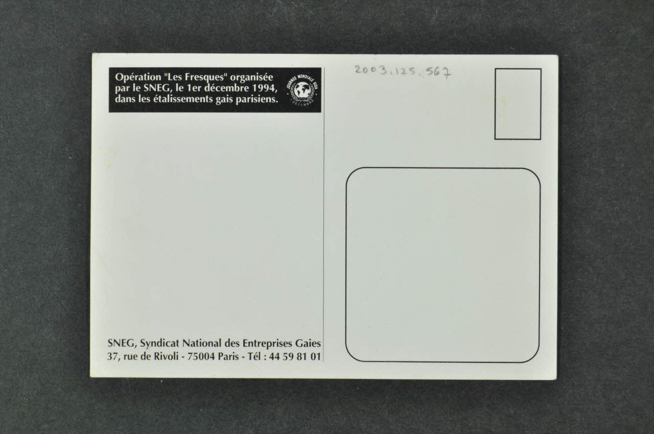 Opération "Les fresques" organisée // par le SNEG, le 1er décembre 1994, // dans les établissements gais parisiens // // JOURNEE MONDIALE SIDA (Imprimés en blanc dans un rectangle noir.), versoDécor