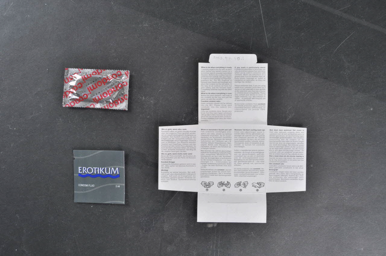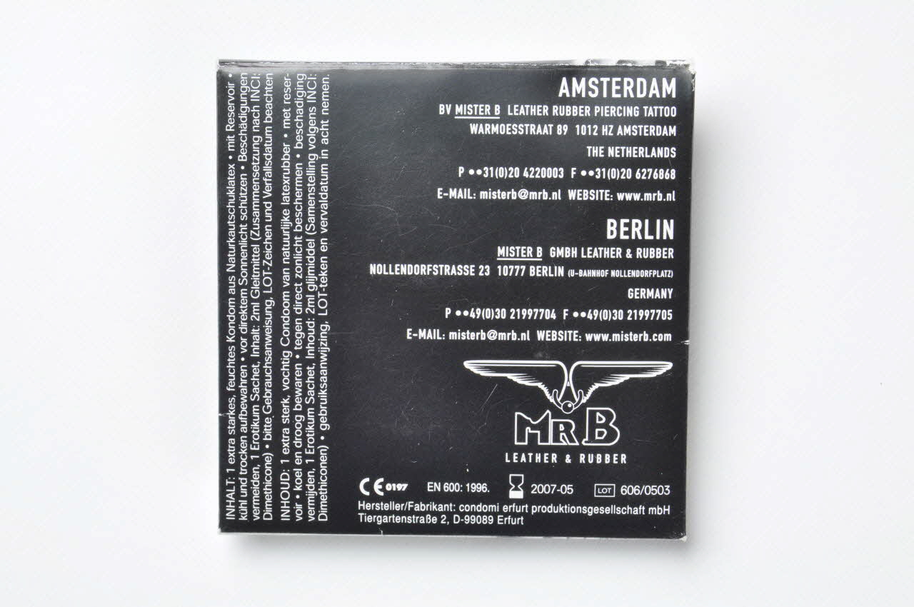 Sur la couverture, photographie noir et blanc de deux jambes sur lesquelles on voit un slip et un pantalon de cuir baissé. En bas, à droite, le logo de l'entreprise Mr B est imprimé. Au dos, on trouve les adresses de Mr B à Amsterdam et Berlin. A l'intérieur, sont imprimés des conseils d'utlisation en anglais, allemand et flamand avec quatre petits schémas. A l'intérieur, on trouve un préservatif contenu dans une enveloppe rectangulaire gris métallisé couverte d'inscriptions en lettres rouges, et une petite enveloppe carrée grise, contenant du lubrifiant.Inscriptions