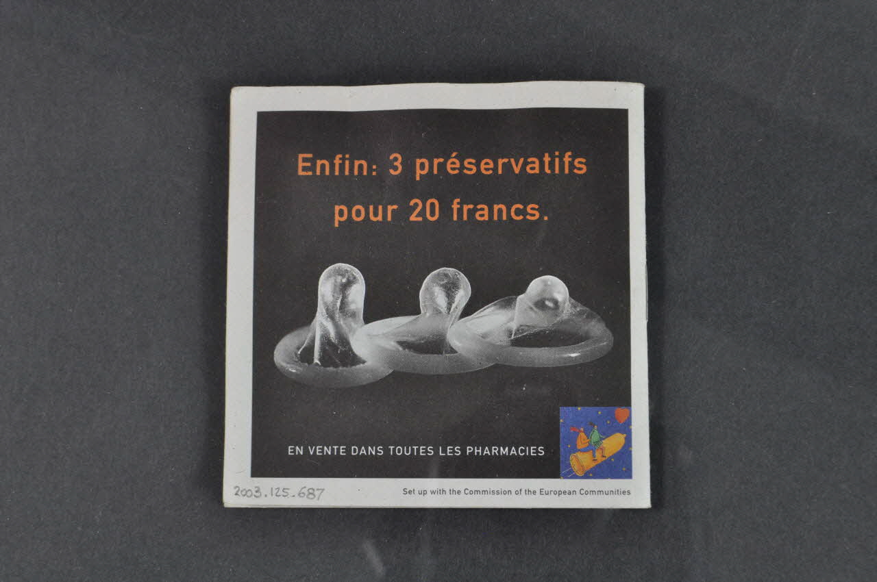 With the partnership of [...] // // this document is free // // [...] (En lettres noires sur fond brun.), à l'intérieurEnfin: 3 préservatifs // pour 20 francs. // [...] (En haut et en bas, en letrtes oranges et blanches sur fond noir.), versoLégende, adresse