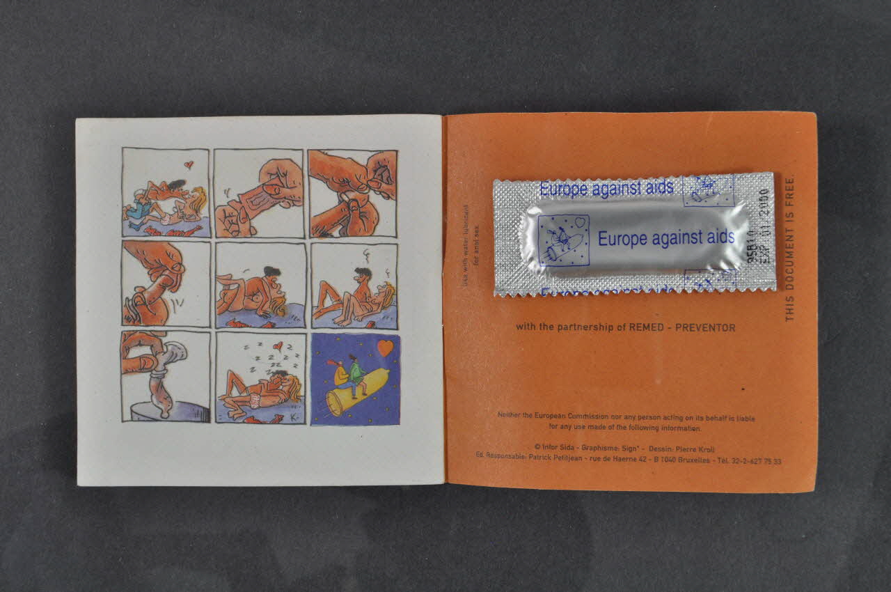 L'étui de préservatif se présente sous la forme d'un livret-passeport de treize pages. La couverture à fond blanc, a reçu en son centre le visuel de la campagne contre le sida de l'année. Un jeune garçon et une jeune fille volent dans un ciel bleu étoilé, à califourchon sur un préservatif jaune. Ils se dirigent vers un coeur. Le garcon tient la fille qui est devant par la taille, et elle lui tient le genou. Au coin en bas à droite, une marque rouge de tampon a été laissée, et une inscription bleue en lettres capitales se trouve au sommet de la composition. Au dos du dépliant, sur un fond noir encadré de blanc, en lettres oranges, se trouve une photographie noir et blanc de trois préservatifs. En haut et en bas se trouve deux inscriptions en lettres oranges et blanches sur fond noir. A l'intérieur du livret, sept scènes sous la forme de bandes dessinées sont représentées sur sept pages, dans différentes langues, avec une traduction en anglais en bas de chacune. Les illustrations se présentent dans l'ordre qui suit: un garçon et une fille nus sur un lit; un garçon et une fille dans un café; un garçon et une fille arrivant dans une chambre; un garçon avec un sac à dos s'adresse à un homme assis, une vieille femme lui répond; ; un couple enlacé discute; un garçon et une fille sous une tente; deux garçons se promenant; deux filles discutant sur la plage; un garçon et une fille sur un bateau. Les trois pages suivantes présentent, pour dix-sept pays ( Autriche, Belgique, Danemark, Finlande, France, Allemagne, Grèce, Irlande, Italie, Luxembourg, Pays bas, Portugal, Espagne, Royaule Uni, Suède, Suisse, Norvège): un numéro de téléphone d'information, heures d'ouverture, où acheter des préservatifs, qualité standard des préservatifs, coût moyen, nom classique, nom populaire. La page suivante montre neuf vignettes illustrant la pose du préservatif à travers une petite histoire. Le dos de couverture est coloré en brun. Un préservatif emballé dans une enveloppe argentée est collé au centre. Les noms des partenaires de la campagnes sont indiqués autour, en caractères noirs.Inscriptions