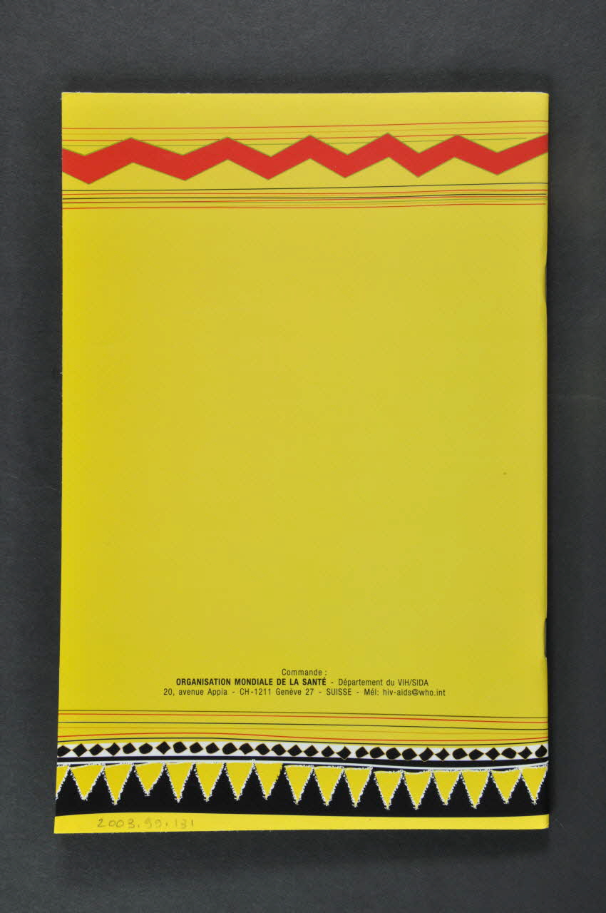La couverture et de couleur jaune. Elle comporte une frise de triangles noirs et jaunes dans le bas, accompagnée d'une autre frise de losanges irréguliés au dessus et de lignes de plusieurs couleurs. Dans le haut, il s'agit d'une bande rouge traversant la page en dent de scie, au milieu de lignes de plusieurs couleurs. Le titre de la brochure est inscrit au centre en noir et rouge au dessus du ruban rouge sida. Le logo d'une association se trouve dans le bas, et représente un globe terrestre en dessous d'un serpent entourant un baton. Le dos de la brochure comporte les mêmes couleurs et motifs , avec les coordonnées de l'association dans le bas de la page. L'intérieur de la brochure comporte des textes sous forme de paragraphes séparés par des titres en grands caractères. On trouve également la présence de plusieurs tableaux gris.Inscriptions