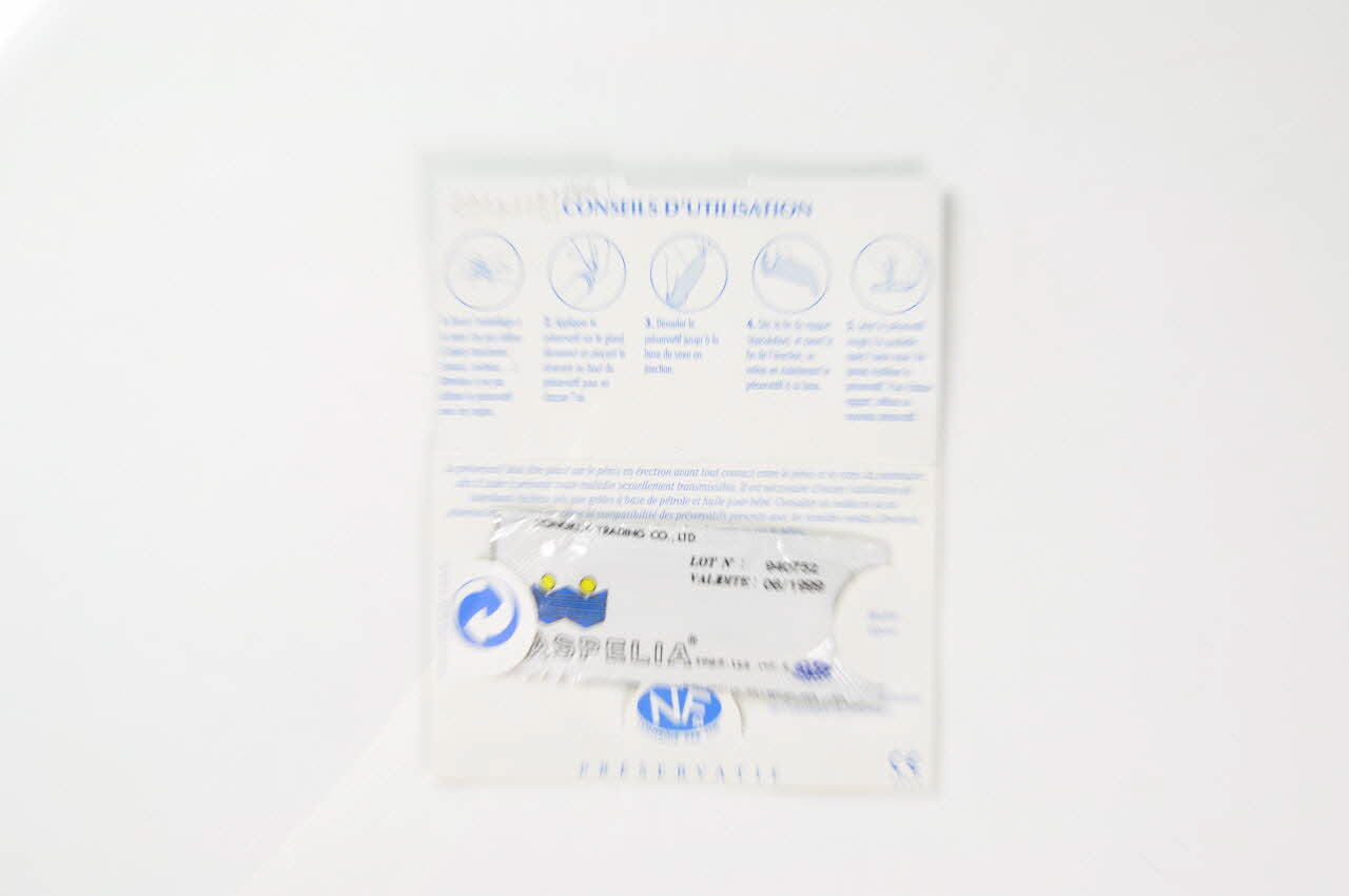 Enveloppe rectangulaire, en carton, à deux volets. A l'intérieur sont découpée une patte de fermeture et trois pattes servant à loger le préservatif.