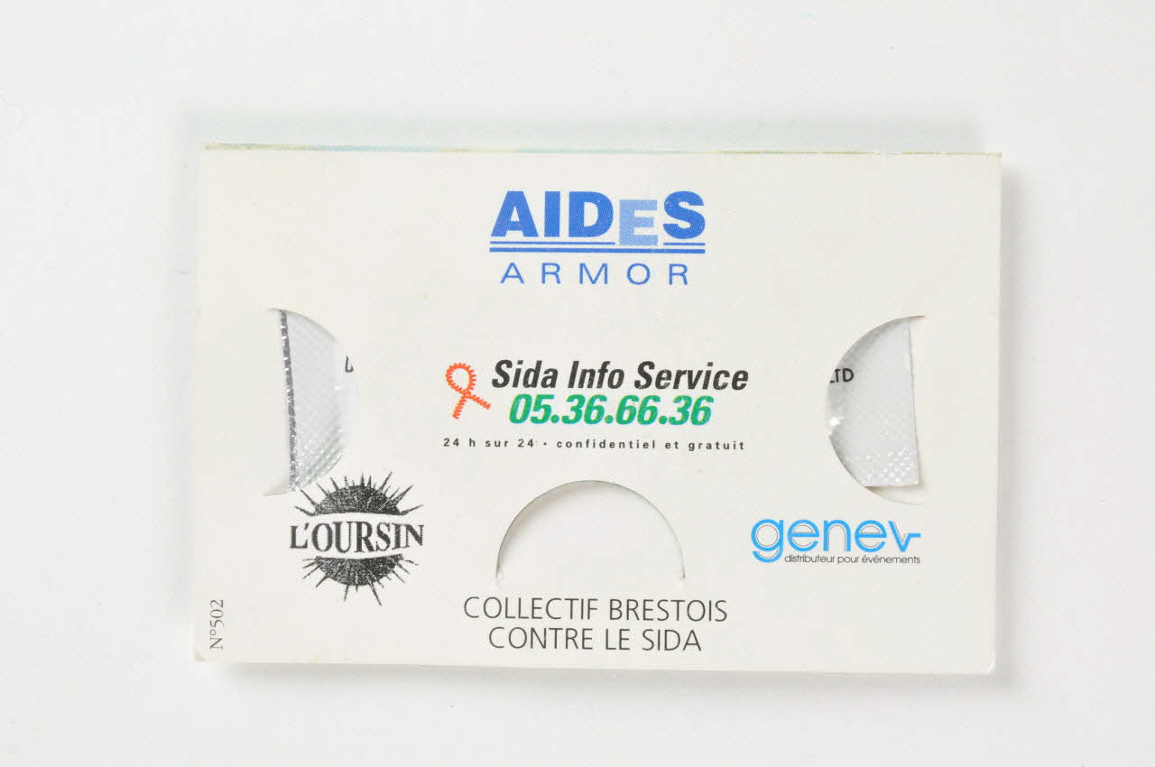Sur l'avant est imprimée une vue peinte de marine, figurant des bateaux à voile sur la mer. A gauche en haut, un ruban rouge. Au centre figure la date de l'événement. Au dos, sur fond blanc, on trouve les logos de AIDES Armor, Sida Info Service, Collectif brestois contre le sida, l'Oursin, Genev. A l'intérieur, en bleu sur fond blanc, sont imprimés des conseils d'utilisation (cinq petits schémas légendés). A l'intérieur est rangé un préservatif contenu dans un étui rectangulaire en plastique blanc, imprimé du logo d'Aspelia (bleu et jaune et Aspelia en capitales bleues).Inscriptions