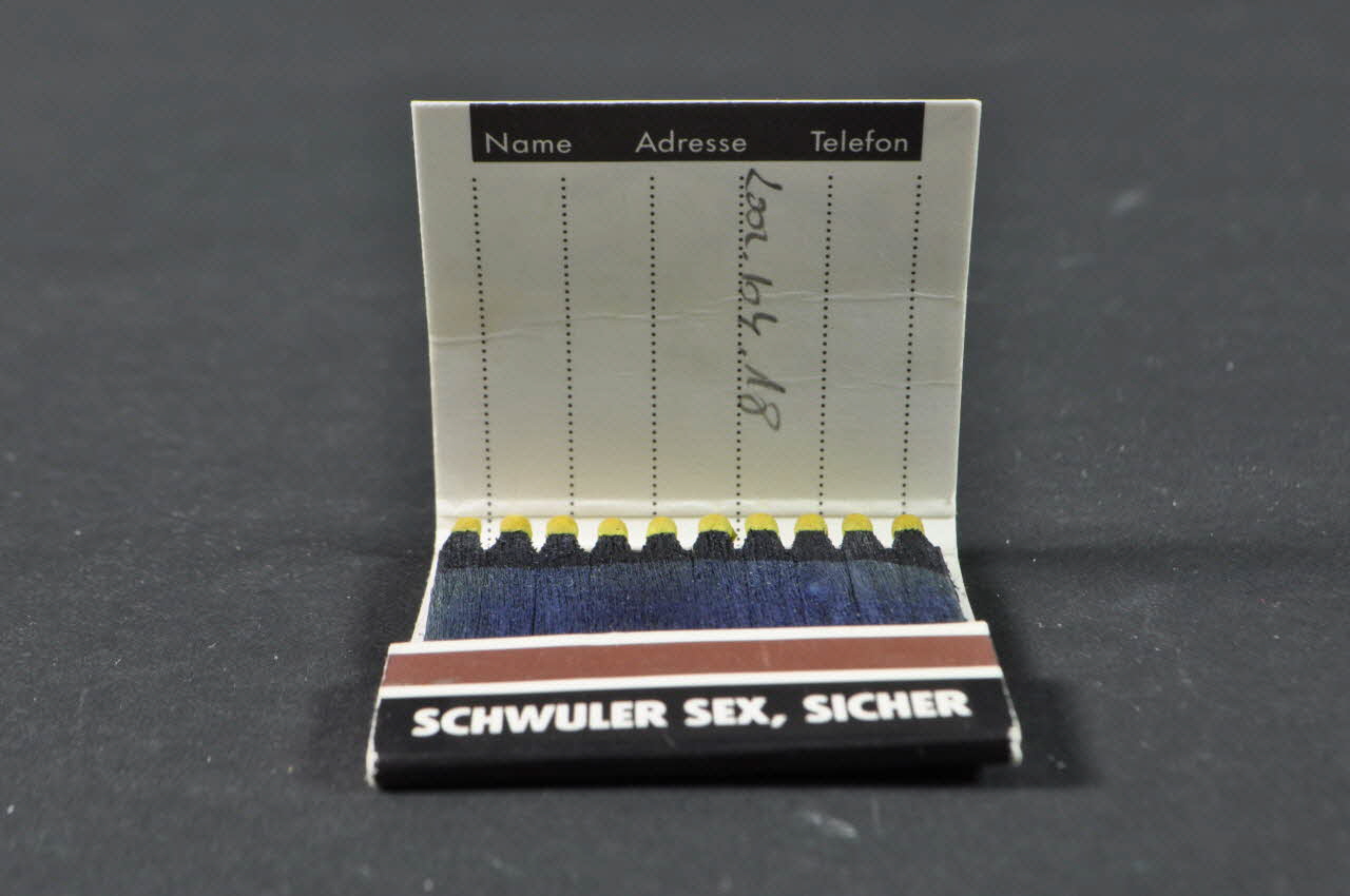 Lieu : AllemagneUtilisateur : Deutsche Aids-HilfePrévention ciblée aux établissements gays. Pratique usuelle de « drague » (proposer une allumette en laissant ses coordonnées) s’accompagnant d’un slogan de prévention.