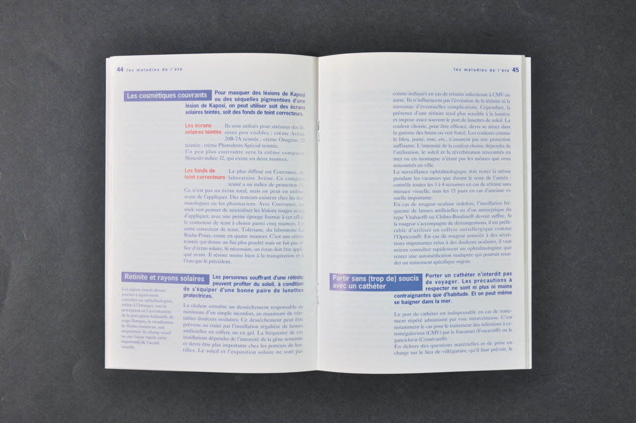 Avant de partir // - Le rendez-vous chez le médecin // - La pharmacie du voyageur // - Les conditions de délivrance des médicaments // - Les vaccinations // - Feu vert pour les enfants // - Le rôle du médecin traitement // // La continuité des soins // - HAD : d'un domicile à l'autre // - Pendant les vacances... // l'essai continue // - Toxicomanes : comment éviter ou amortir les ruptures de soins // - Vu de Montpellier // // Les maladies de l'été // - Pathologies tropicales // - Quelques conseils alimentaires // - Comment contrer la turista // - Avion : gare aux oreilles // - Connaître et prévenir les risques de sensibilité accrue au soleil // - Plage et dermatose // - Les cosmétiques couvrants // - Rétinite et rayons solaires // - Partir sans (trop) de soucis avec un cathéter // - Cathéter : prévenir les accidents // - Systèmes de perfusion ambulatoire // - Coup de blues // // A l'étranger // - La liste noire et quelques bons numéros // - Remboursement des soins // - L'assistance // - Retour au pays // // Services // - Maisons de repos // - Centres de vacances et familles d'accueil // - Pour ceux qui restent // - Où faire un aérosol? // - Réseaux ville-hôpital // - Réseaux ville-hôpital toxicomanie (Sur les pages 2 et 3, en bleu.), à l'intérieurDate