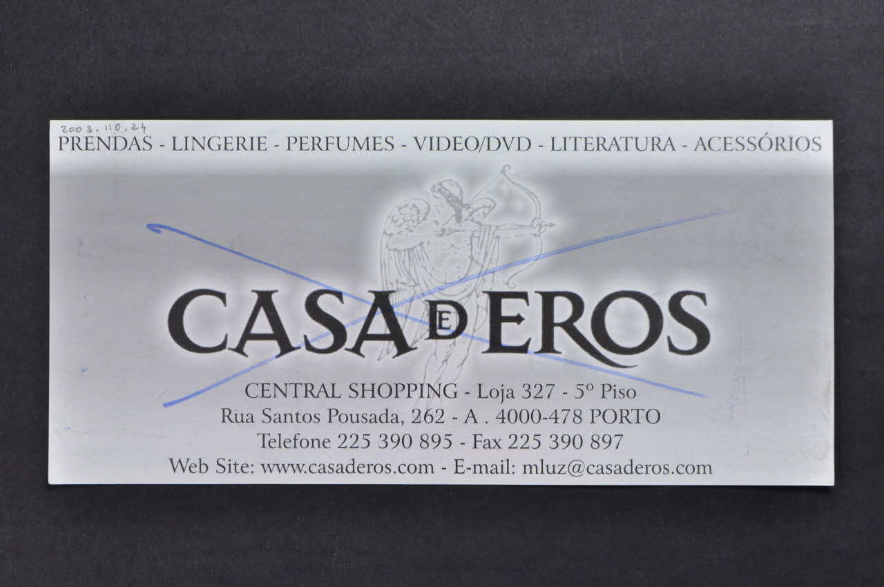 Le verso est sur fond blanc et est occupé par une publicité pour la boutique "Casa de Eros" barrée d'une croix au feutre bleu.