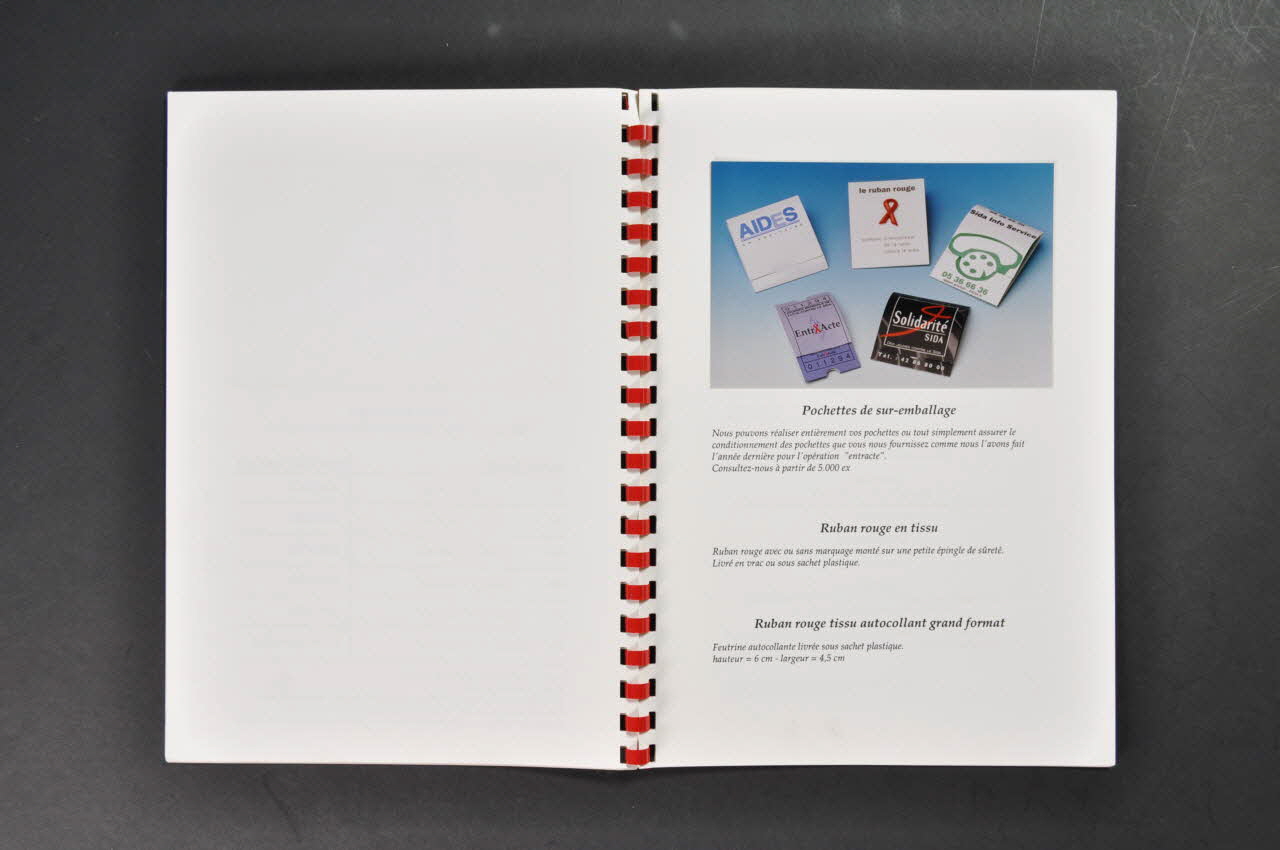Nous sommes fondamentalement contre les sociétés privées qui vendent le "ruban rouge", engrangent la majorité des bénéfices et reversent à une association quelques centimes pour se justifier... // // Nous pensons que ce sont les associations qui doivent être les initiatrices et les bénéficiaires des opérations liées au "ruban rouge" // // Nous avons déposé l'ensemble des designs et modèles que nous avons créés mais jamais nous nous permettrons de mettre en cause une association qui aura repris nos designs et modèles pour les faire réaliser ailleurs. // // Martine BEREJ (Imprimé en noir sur la dernière page), à l'intérieur