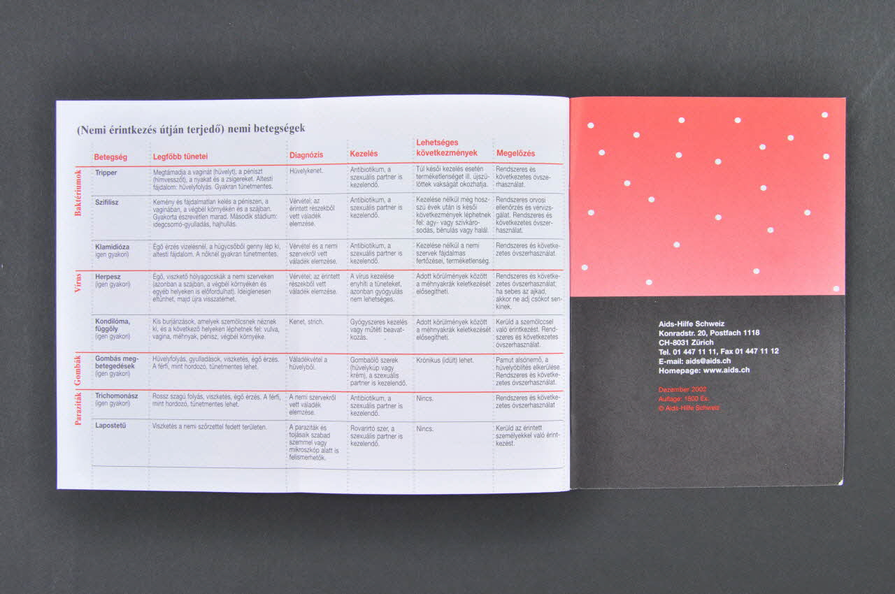 Az AIDS és egyéb, nemi úton terjedö betegségek [...] .....7 // A HIV-teszt [...] .....9 // Hepatitisz (fertözö májgyulladás) [...] ....12 // Safer Sex vagy: hogyan védekezhetek a // legbiztonságosabban a szex közben? [...] .....15 // Most pedig beszéljünk az óvszerekröl [...] .....19 // Az egészséged nem a véletlenen múlik, // te magad befolyásolhatod! [...] ......23 // Fogamzásgátlás [...] ......25 // Beteg vagyok! Ki fizet? [...] ......29 // Jogok és kötelességek - amit erröl tudnod kell! [...] .......31 // Sex, no drugs & roll, roll, roll, [...] .......43 // Kábítószerek és a szex [...] .......44 // (Nemi érintkezés útján terjedö) nemi betegségek [...] .....48 (Imprimé en page 5, en noir, souligné de rouge.), à l'intérieurLogo