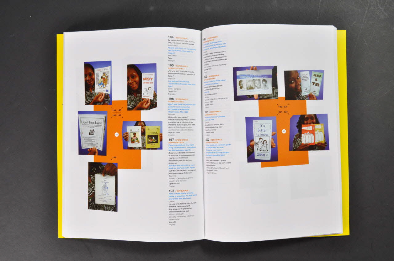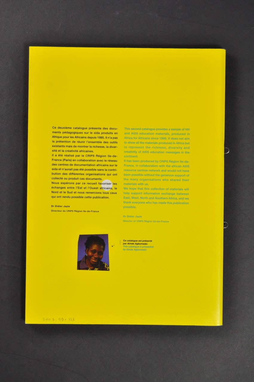 Précisions sur le contenu : Introduction : de quel type de prévention les gens ont besoin : "matériels détaillés et objectifs leur permettant de décider eux-mêmes comment vivre leur vie... / matériels qui identifient, extraient et étendent les connaissances déjà acquises... matériels qui respectent les cultures et les attitudes des personnesdésireuses de s'informer, que ce soit en rapport avec les pratiques traditionnelles ou la culture de la rue... matériels qui ne se contentent pas de communiquer des informations mais qui encouragent et développent les compétences de vie psychosociale requises pour permettre de lesmettre efficacement en pratique... telles que la conscience de soi, l'assurance et les capacités de négociation... matériels qui encouragent la pensée et la prise de décision rationnelles plutôt que la peur ... matériels qui posent des questions tout autant qu'ils fournissent des réponses... matériels qui détruisent plutôt que renforcet les stéréotypes...matériels qui contribuent à l'élimination des stigmates Présentation des affiches et documents en 11 rubriques. Pays représentés : Afrique du Sud / Angola / Bénin / Botswana / Burkina Faso / Burundi / Cameroun / Congo / Comores / Côte d'Ivoire / Djibouti / Ethiopie / Gabon / Ghana / Guinée / Kenya / Madagascar / Mali / Maroc / Maurice / Mozambique / Namibie / Niger / Nigeria / Ouganda / République Centrafricaine / République démocratique du Congo / / Rwanda / Sénégal / Soudan / Tanzanie / Tchad / Togo / Tunisie / Zambie / Zimbabwe Présentation des documents de prévention par petites photos couleur, présentés par des personnes : affiches, brochures, dépliants, BD, journal, calendrier, autocollants, badge, BD, règle, cassette audio et vidéo, disque, pagne, tee shirt, écharpe, préservatif. Dernière page : coordonnées des éditerurs et quelques lignes de présentation. CRIPS Päris / Appropriate Health Resources & Technologies Action Group (AHRTAG) / Enda, Dakar Sénégal / CRIPS Dakar / National AIDS Documentation and Information Centre (NADIC) Ouganda.