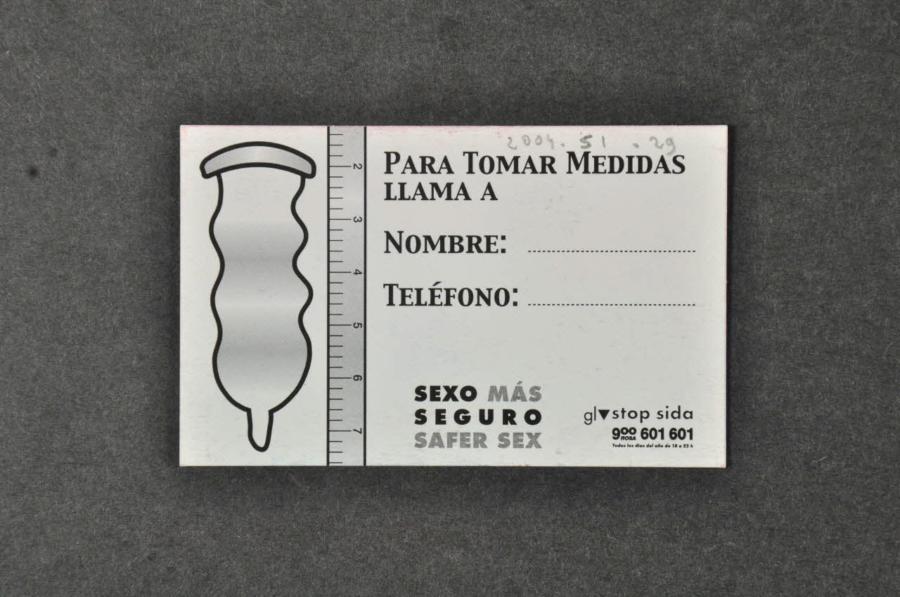 Le recto présente le dessin d'un tailleur vêtu d'un costume bleu, un mètre autour du cou, et une pelote d'épingles au poignet, sur fond rouge. Dans la partie inférieure, il y a le slogan en caractères blancs. Le verso est séparé en deux et imprimé en noir et blanc. A gauche, il y a le dessin d'un préservatif déroulé et à côté un décimètre. A droite, une phrase précède les emplacements pour le nom et le numéro de téléphone. Dans la partie inférieure, se trouvent un slogan et le logo d'une association.Inscriptions