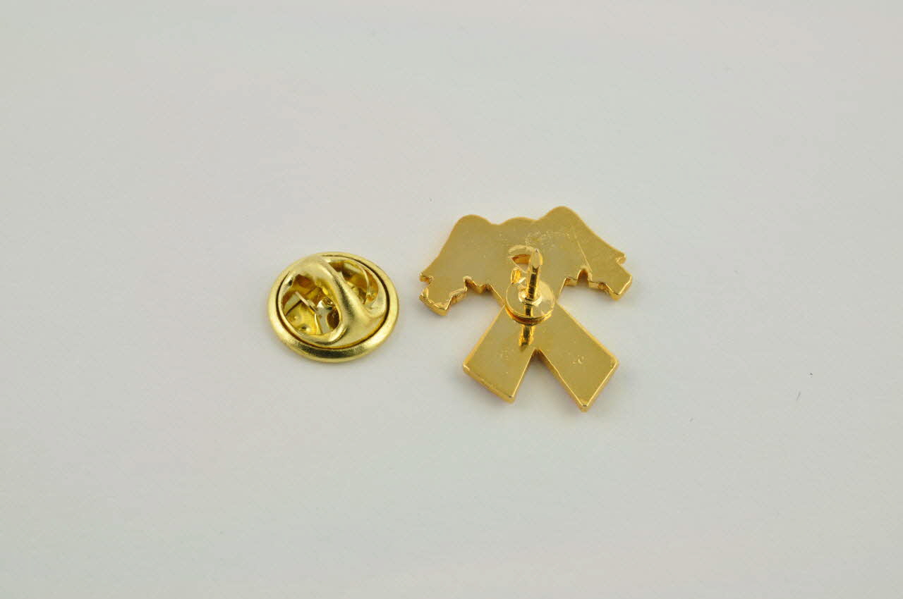 Métal moulé émaillé. / Pin's en métal doré émaillé, prenant la forme d'un ruban rouge bordé de doré. Sur le pan de droite figure une inscription en lettres dorées. De chaque côté du sommet du ruban prennent place deux oiseaux noirs stylisé, bordés de doré.Décor