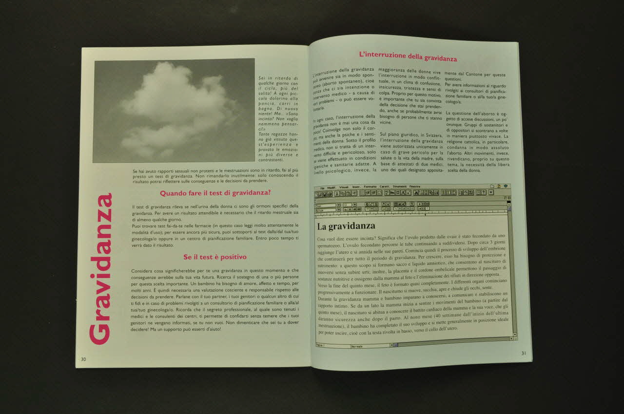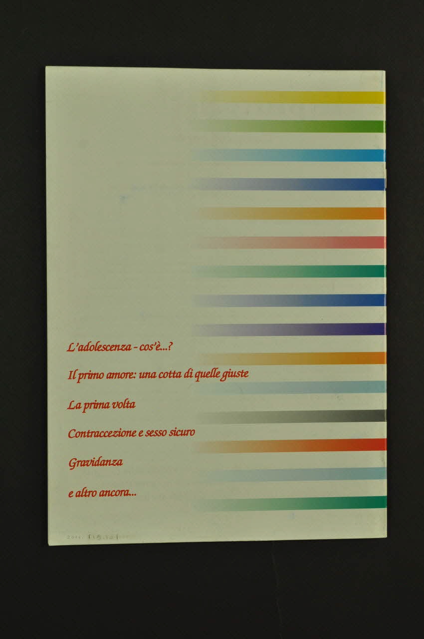 La première de couverture est constituée de deux photographies en noir et blanc figurant les deux mêmes jeunes filles dans des poses différentes en haut et en bas. Le titre est inscrit en rouge au centre, sur la jonction des deux images. De petits traits multicolores bordent le côté gauche ; ils se poursuivent sur l'arrière de la couverture, sur fond blanc. L'intérieur de la brochure contient des textes en italien, certains sur des fonds colorés, avec des photographies et schémas en rapport avec les thèmes abordés : adolescents filles et garçons, appareil génital féminin, pillule, etc.Inscriptions