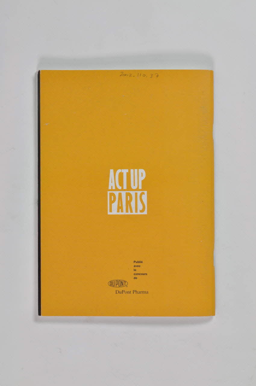 Dos de la brochure jaune avec logo d'Act Up-Paris au centre et mention "Publié avec le concours de DuPont Pharma" en partie inférieure. Dos de la brochure muni d'un rabat intitulé "molécules" avec une présentation d'Act-Up et une présentation des médicaments anti-hiv.