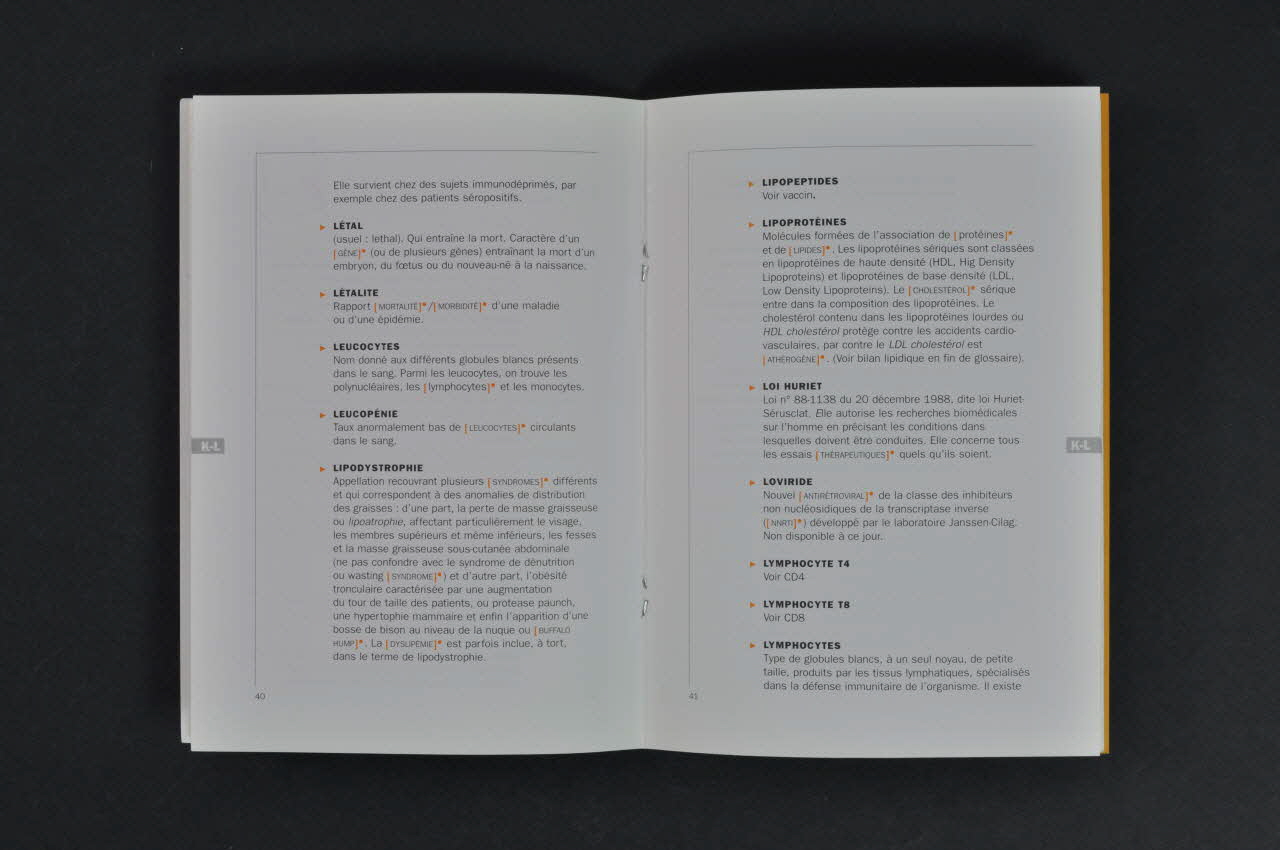 Brochure à couverture souple noire bordée à la verticale, le long de la tranche, de l'inscription "information=pouvoir" en caractère gras gris. Au centre de la couverture titre en caractère blanc et jaune "SIDA un glossaire. Mise à jour juin 2000" surplombant deux petites vignettes jaunes de photos médicales au microscope. Dans l'angle inférieur droit "Act-Up Paris TM".