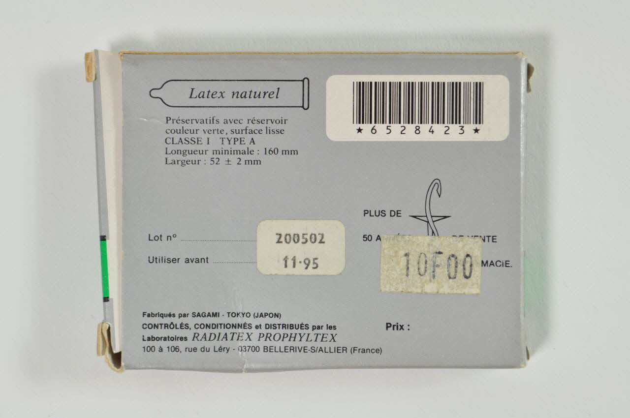 Boîte rectangulaire en carton plié, de couleur grise. Destinée à contenir trois préservatifs, elle est désormais vide. Au recto, une bande verte inscrite de caractères blancs donne les informations principales sur le contenu de la boîte: nom de la marque et logo (tour crénelée), nombre de préservatifs. Au verso se trouvent des inscriptions en lettres noires (schéma du préservatif, nom du laboratoire, date de péremption du produit, typologie...). Le nom du produit et ses caractéristqiues principales sont repris sur les faces latérales de la boîte.Inscriptions