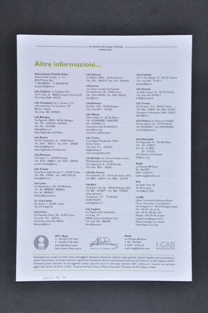 BASE // Nadir onlus HIV TREATMENT GROUP // I-CAB Italian Community Advisory Board (sur la couverture en bas trois logos)Décor