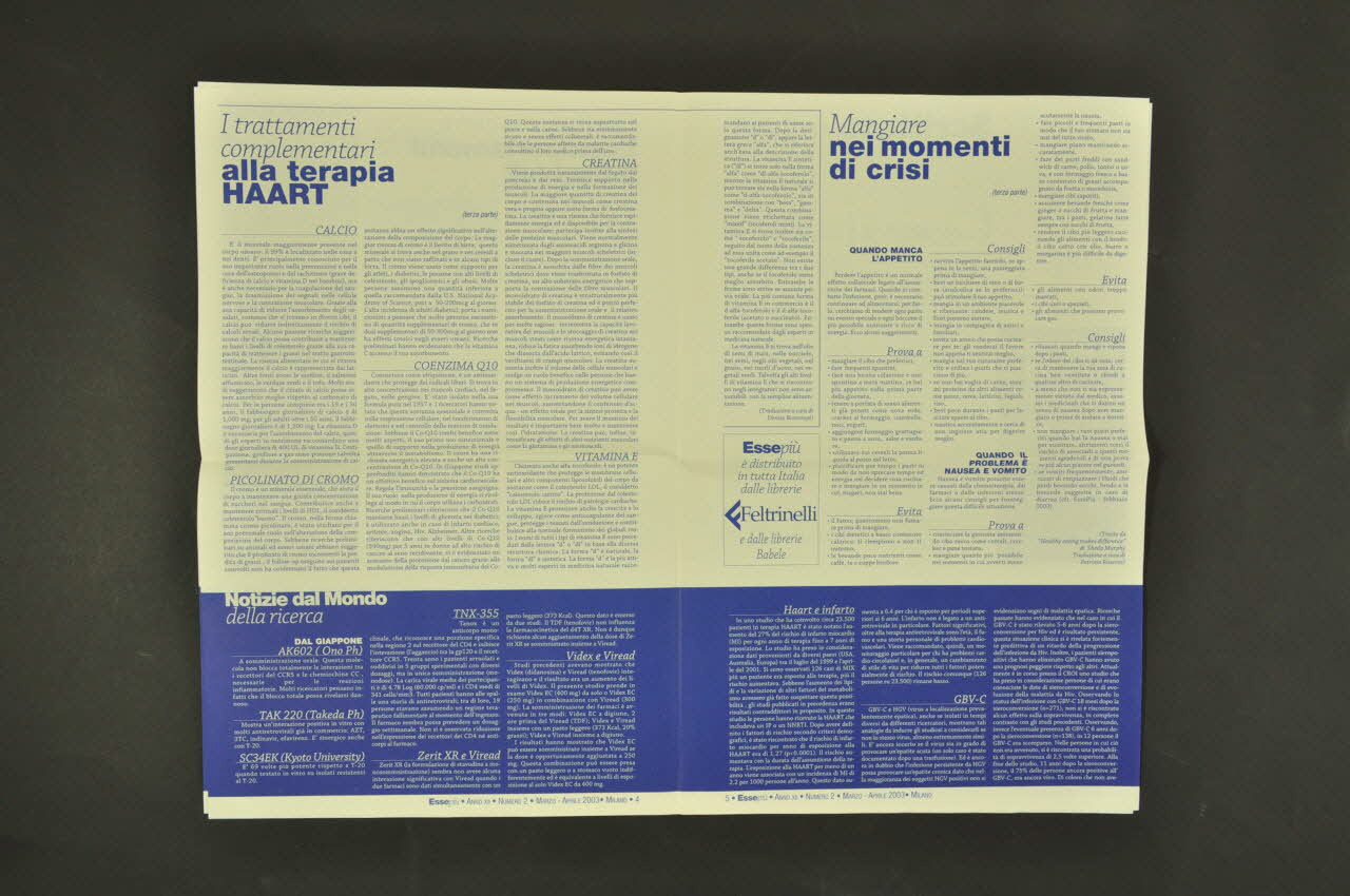 Essepiù / Anno XII . Numero 2 . Marzo - Aprile 2003 . ASA . Associazione Solidarietà AIDS . Milano / Ricordando gli amici / rinnoviamo il nostro impegno / San Vittore : / Grandezza e miseria / di un pezzo / di Milano / In questo / numero / LE RAGIONI / DEI COMPORTAMENTI / A RISCHIO / LA REALTA / DEL CARCERE / DI SAN VITTORE / I TRATTAMENTI / COMPLEMENTARI / ALLA TERAPIA / HAART / Essepiù / Bimestrale dell'ASA / Associazione Solidarietà AIDS (Sur toute la page.), sur la couvertureTexte