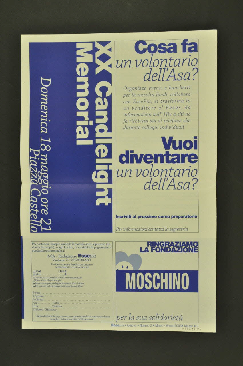 XX Candlelight / Memorial [...] // // [...] ASA - Redazione EssePiù / [...] // // Cosa fa / un volontario / dell'ASA? [...] // // RINGRAZIAMO / LA FONDAZIONE / MOSCHINO / per la sua solidarietà (En quatrième de couverture. Au sein de quatre encadrés distincts.), versoDécor