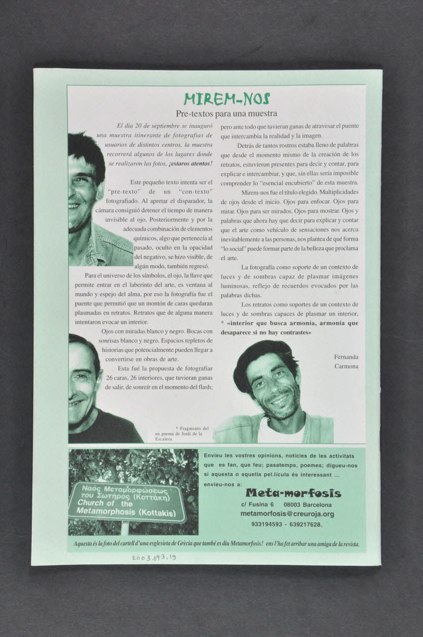 Cette revue en catalan est le numéro 19 de "Meta-Morfosis" et est composée de vingt-sept pages reliées entre elles par des agrafes. La couverture est imprimée en vert, blanc et noir. Le nom et le numéro de la revue sont présents dans le haut, en vert sur fond vert clair et en blanc dans un encadré vert. Quatre visages d'hommes sont dessinés en vert sur blanc au centre de la couverture et sont disposés en deux lignes de deux colonnes. Dans le bas, on trouve du texte en vert et noir. Le dos comprend un encadré rectangulaire blanc contenant du texte en noir. Trois visages d'hommes sont imprimés, dont deux sont tronqués de moitié. Dans le bas, un second encadré vert comprend la photographie d'un panneau entouré de végétation et, sur la droite, du texte en noir, notamment les coordonnées du siège de la revue. Les deux encadrés sont entourés d'une bordure de couleur vert clair. Un sommaire est imprimé en page deux, en noir sur blanc. A l'intérieur, le texte est généralement imprimé en noir sur fond blanc et divisé en plusieurs colonnes. Les titres sont en vert. Certaines pages présentent des encadrés, photographies ou dessins également en vert. Les pages sont numérotées sur leur bord extérieur ; à côté du numéro on trouve, verticalement, le nom de la revue en capitales.Inscriptions