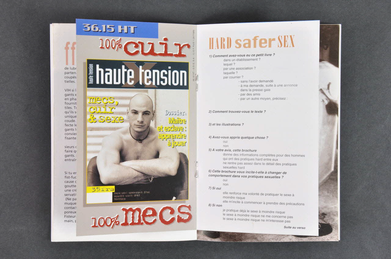 La couverture de la brochure est de couleur brun foncé. En haut à gauche, figure une photo en noir et blanc d'un avant bras masculin serré dans un bracelet de cuir. En dessous, en capitales roses et blanches se trouve le titre de la brochure. En bas, à droite, en petits caractères blanc figure un mot. Le dos présente le même fond brun foncé, avec en bas, un logo. un rectangle rose est présent sous le logo. L'intérieur est composé de textes noirs dont les titres sont noirs ou oranges, de photos d'hommes en noir et blanc et, au centre de la brochure figure un papier glacé cartonné, plié en deux faisant de la publicité pour le magazine.Inscriptions