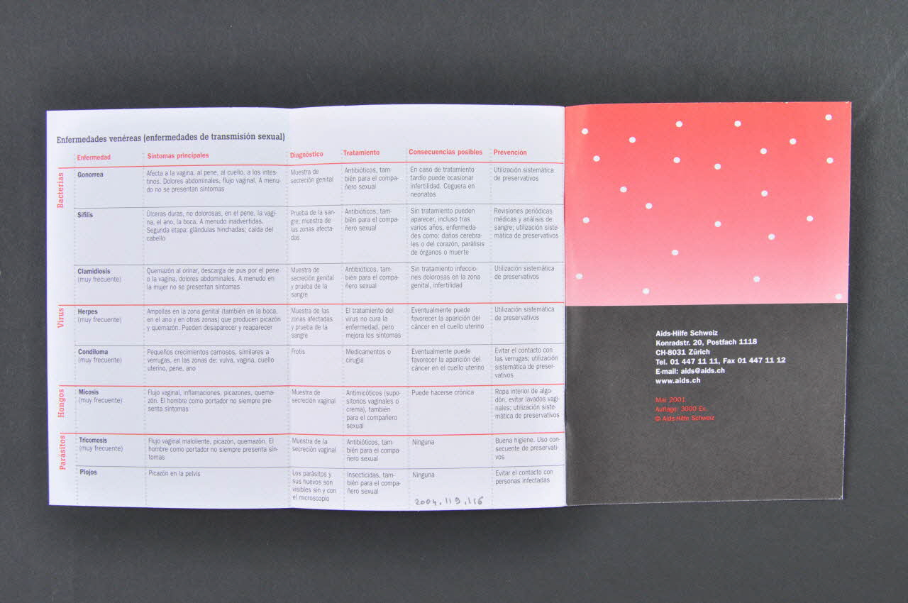 El sida y otras enfermedades de transmisión sexual [...] ...7 // El test de VIH/sida [...] .....9 // Hepatitis [...] .....12 // Sexo seguro o... // ¿cuál es la manera más segura para protegerme durante el acto sexual? [...] ......15 // Hablemos sobre los preservativos [...] ......19 // Tu salud no es una coincidencia, tú puedes influenciar en ella [...] .......23 // Anticoncepción [...] .......25 // ! Enferma! ¿Quién paga? [...] ........29 // Derechos y obligaciones - // y lo que tú debes saber al respecto [...] ........31 // Sexo, no a las drogas y adelante, adelante, // adelante [...] ........43 // Drogas y trabajo sexual [...] ........44 // Enfermedades de transmisión sexual [...] ........48 (Imprimé en page 5, en noir, souligné de rouge.), à l'intérieurConcernant la date
