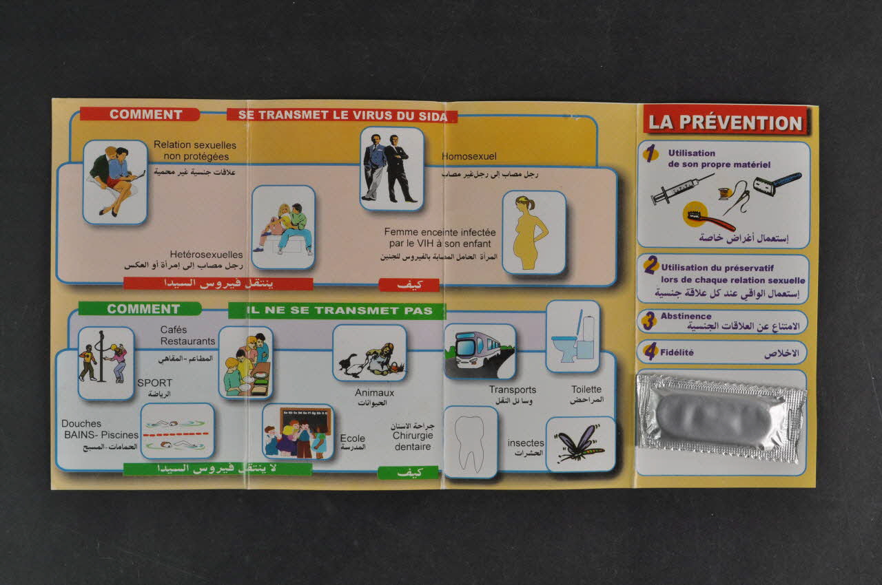 Le volet 4 à fond jaune présente un titre : en capitales blanches sur bandeau rouge : "La prévention". En dessous, cinq rectangles blancs encadrés de bleu, caractères violets, en français et en arabe : 1 Utilisation de son propre matériel (dessin de seringue, rasoir, brosse à dents, aiguille et fil) / 2. Utilisation du préservatif lors de chaque relation sexuelle / 3. Abstinence / 4. Fidélité / Sur le cinquième rectangle, est agraphé un préservatif rectangulaire dans enveloppe argent métallisé.