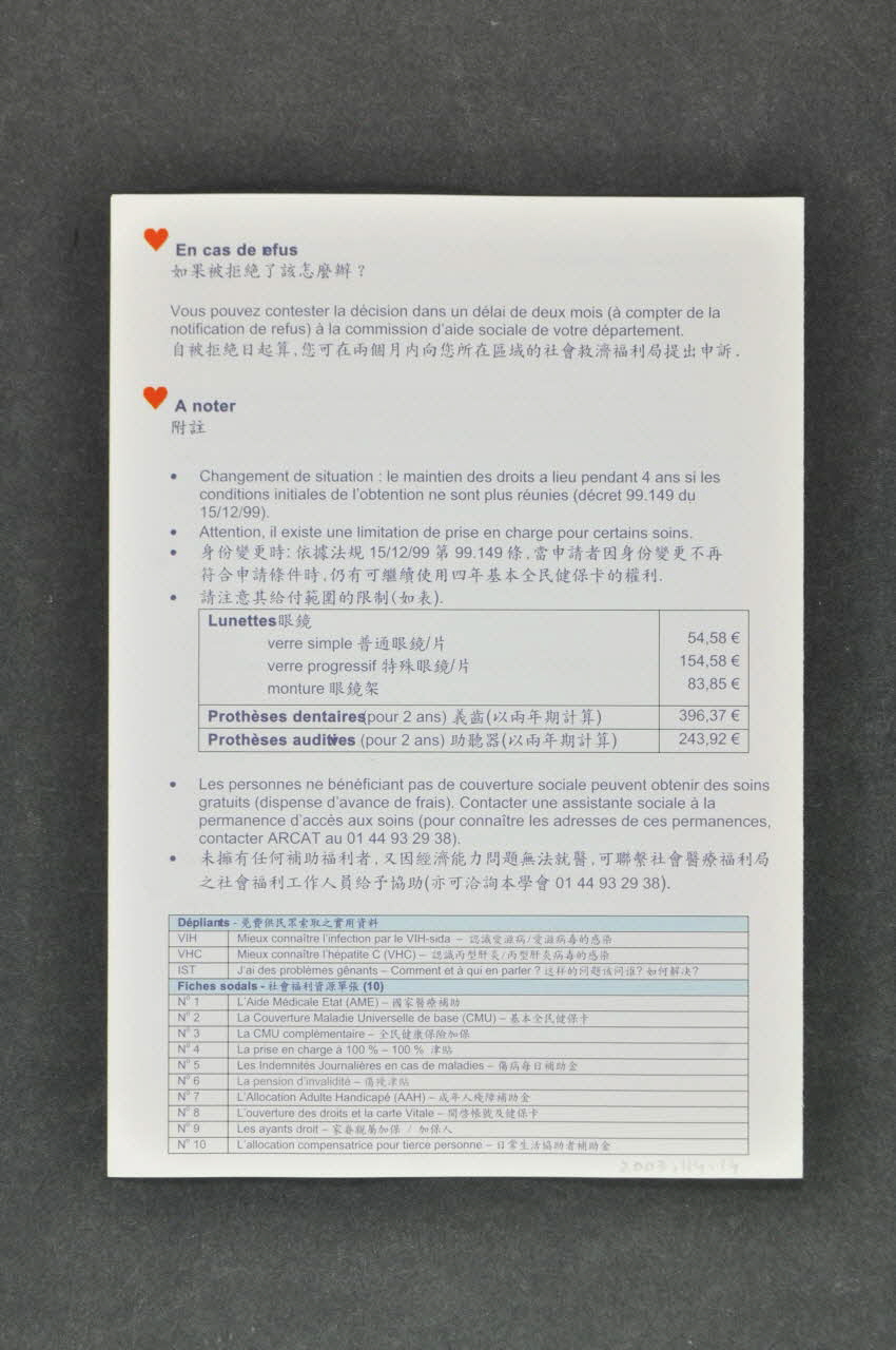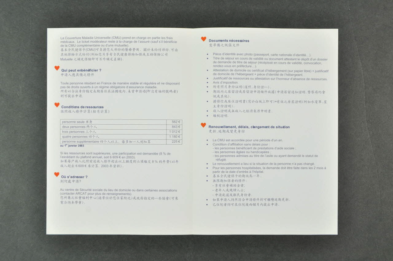 Dépliant, Fiche sociale n°2 " La Couverture Maladie Universelle (CMU)" (en chinois)