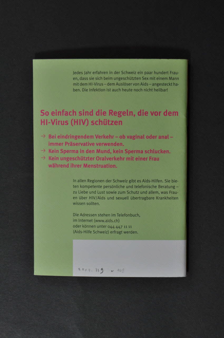 BROCHURE, "Liebe, Lust & Schutz. Was Frauen ûber HIV/Aids und andere sexuell übertragbare Krankheiten wissen sollten" (Amour, plaisir et protection. Ce que les femmes doivent savoir sur le VIH/sida et sur les maladies sexuellement transmissibles).