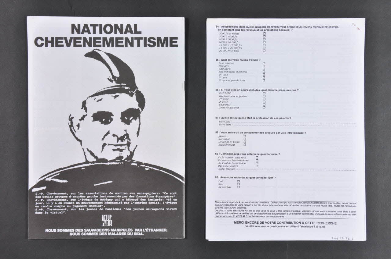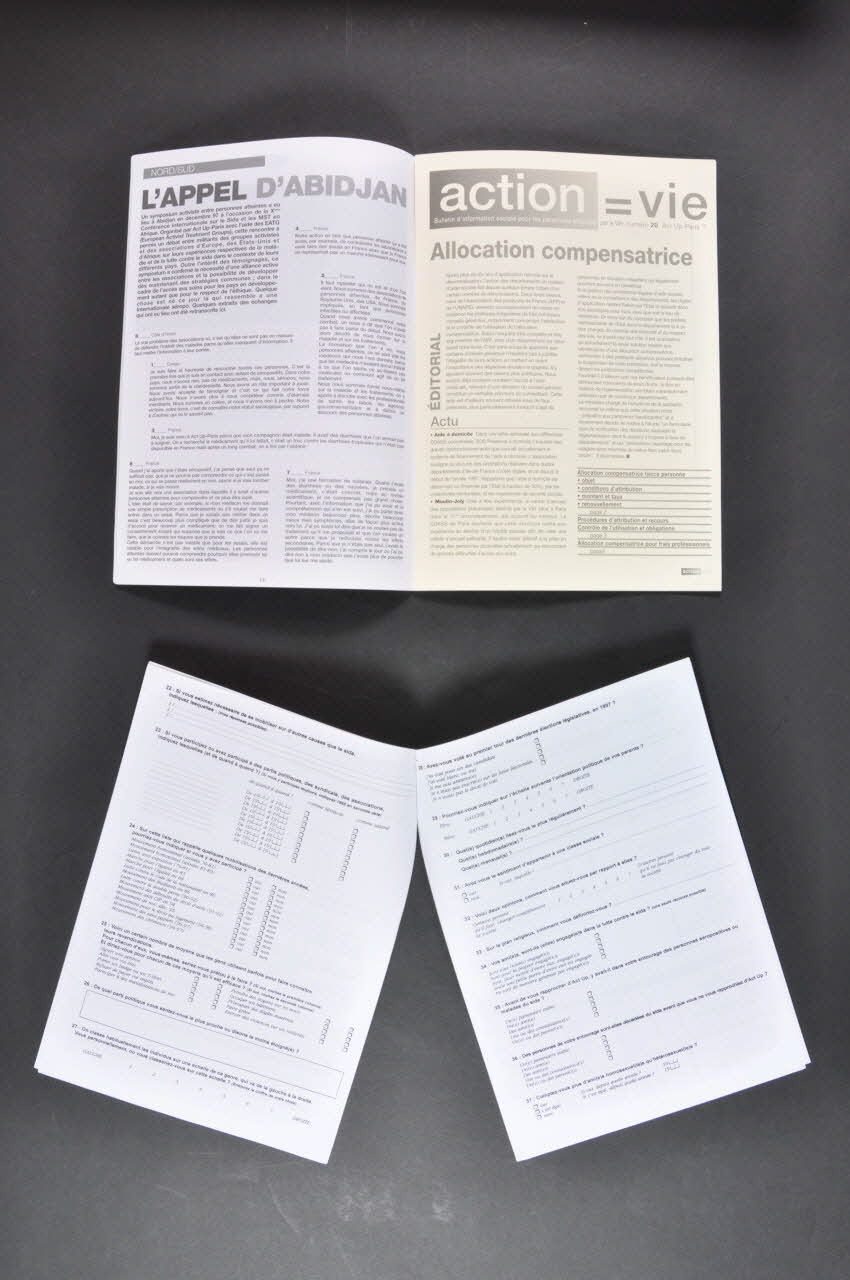 Cette revue (2003.97.70.1) est la lettre mensuelle n°53 de l'association Act-Up-Paris et est composée de trente pages reliées entre elles par des agrafes. Imprimée en noir et blanc et en français, la couverture comprend une photographie prenant presque toute la page et représentant un couple de femmes assises sur la marche d'une porte. Du texte est imprimé dans le haut. Le dos comprend une image en noir ainsi que du texte dans le haut et dans le bas. Un sommaire est présent sur la page 2. A l'intérieur, le texte est imprimé en noir sur blanc ou en blanc sur noir. Certaines pages comprennent des photographies ou des illustrations toujours en noir et blanc. Aucune couleur n'est présente. Au centre de la revue, quatre pages sont imprimées en noir sur du papier jaune plus épais et correspondent au bulletin mensuel destiné aux personnes atteintes par le VIH. Les pages 27 et 28 sont consacrées à une enquête du CNRS. A l'intérieur se trouvent quatre pages reliées entre elles par une agrafe seule. Il s'agit d'une enquête CNRS sur les associations de lutte contre le Sida (2003.97.70.2). Les huits pages sont imprimées en noir et comprennent des questions, des encadrés et des cases à cocher.Inscriptions
