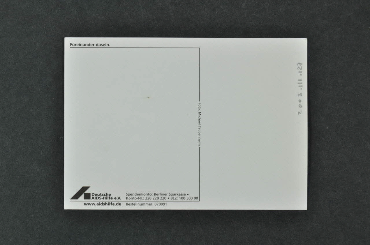 Deutsche // AIDS-Hilfe e.V. (Logo composé de deux traits épais noirs dont le premier est incliné et repose sur le deuxième. A droite, le nom de l'association est imprimé en noir sur deux lignes. Ce logo est situé dans l'angle inférieur gauche), versoDécor