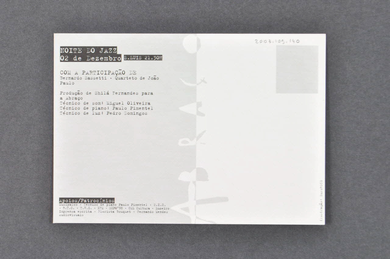 Apoios / Patrocinios / Musipalco . Tecnico de piano Paulo Pimentel . S.I.C. / . R.T.C. . T.V.I. . EXPO'98 . CML Cultura . Luzeiro / Imprensa escrita . Florista Bouquet . Fernando Mendes / Audiovisuais (Inscription imprimée en petit, en bas de la moitié gauche du dos de la carte avec la première ligne imprimée en blanc sur une bande noir et la suite imprimée en noir sur le gris du fond.), versoNOITE DO JAZZ / 02 de Dezembro / S. Luis 21.30H / COM A PARTICIPAÇÃO DE / Bernardo Sassetti. Quarteto de João / Paulo / Produção de Shila Fernandes para / a Abraço / Técnicode som : Miguel Pliveira / Técnico de piano : Paulo Pimentel / Técnico de luz : Pedro Momingos (Inscription placée au dos de la carte; en haut de la moitié gauche. Elle est imprimée en noir avec la date et l'heure de l'évènement précisés en haut, en blanc sur des bandes noires horizontales.), versoABRAÇO (Logo de l'association éditrice de la carte, imprimé en blanc et gris, au dos de la carte, verticalement, au niveau de la jonction entre la moitié grise de gauche et la moitié blanche de droite.), versoIlustração : EuroRSCG (Petite inscription imprimée verticalement, en noir, au dos de la carte, en bas, le long du côté droit.), versoDécor
