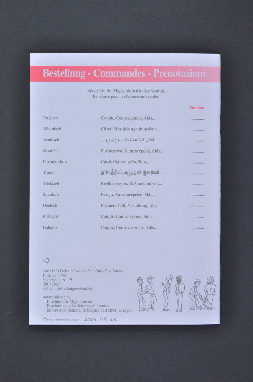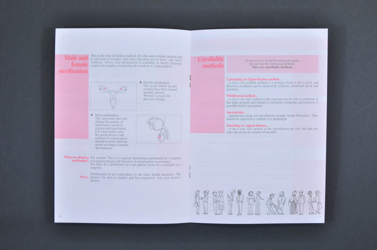 11 éditions en langues différentes de la brochure : anglais (2004.119.023), albanais, arabe, croate (2004.119.018), portugais (2004.119.016), tamoul (2004.119.020), turc (2004.119.017), espagnol (2004.119.019), allemand (2004.119.014), français (2004.119.015), italien (2004.119.024) Sommaire - p.2 Les organes génitaux de la femme (schéma anatomique) - p.3 Les organes génitaux de l'homme (schéma anatomique) - p.5 La contraception (différentes méthodes dont le préservatif féminin) - p.13 Vos droits (prise en charge...) - p.14 Les maladies sexuellement transmissibles - p.16 Le Sida (comment le virus se transmet-il / comment éviter la transmission / comment détecter l'infection à VIH / moded d'emploi du préservatif masculin - p.18 La grossesse - p.2O L'interruption de grossesse