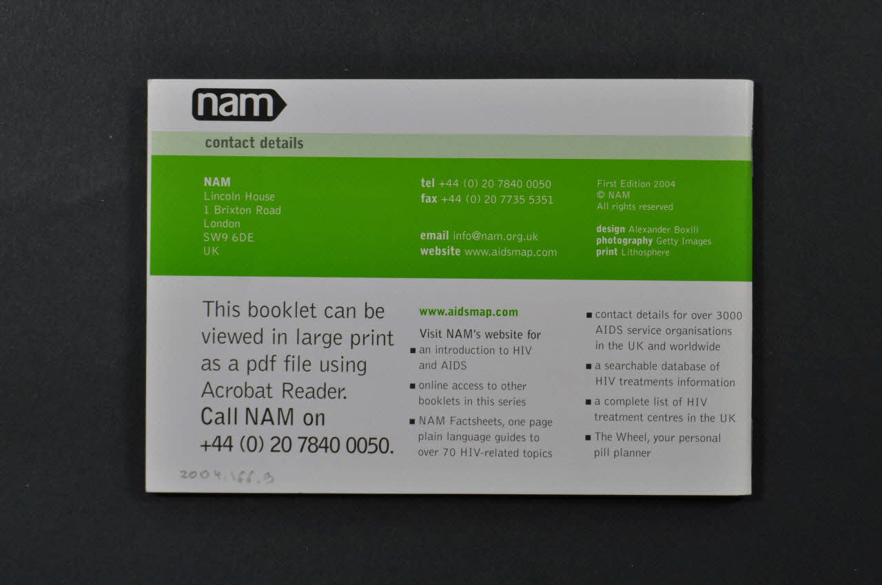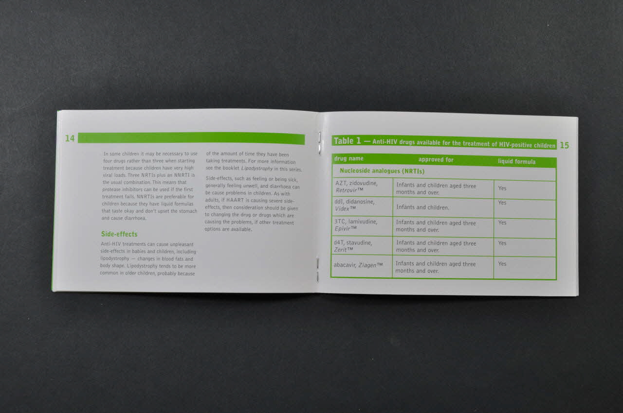 information series for hiv-positive people (inscription en gris sur fond vert clair dans la bande verticale en haut de la couverture, au-dessus du titre), sur la couvertureDécor